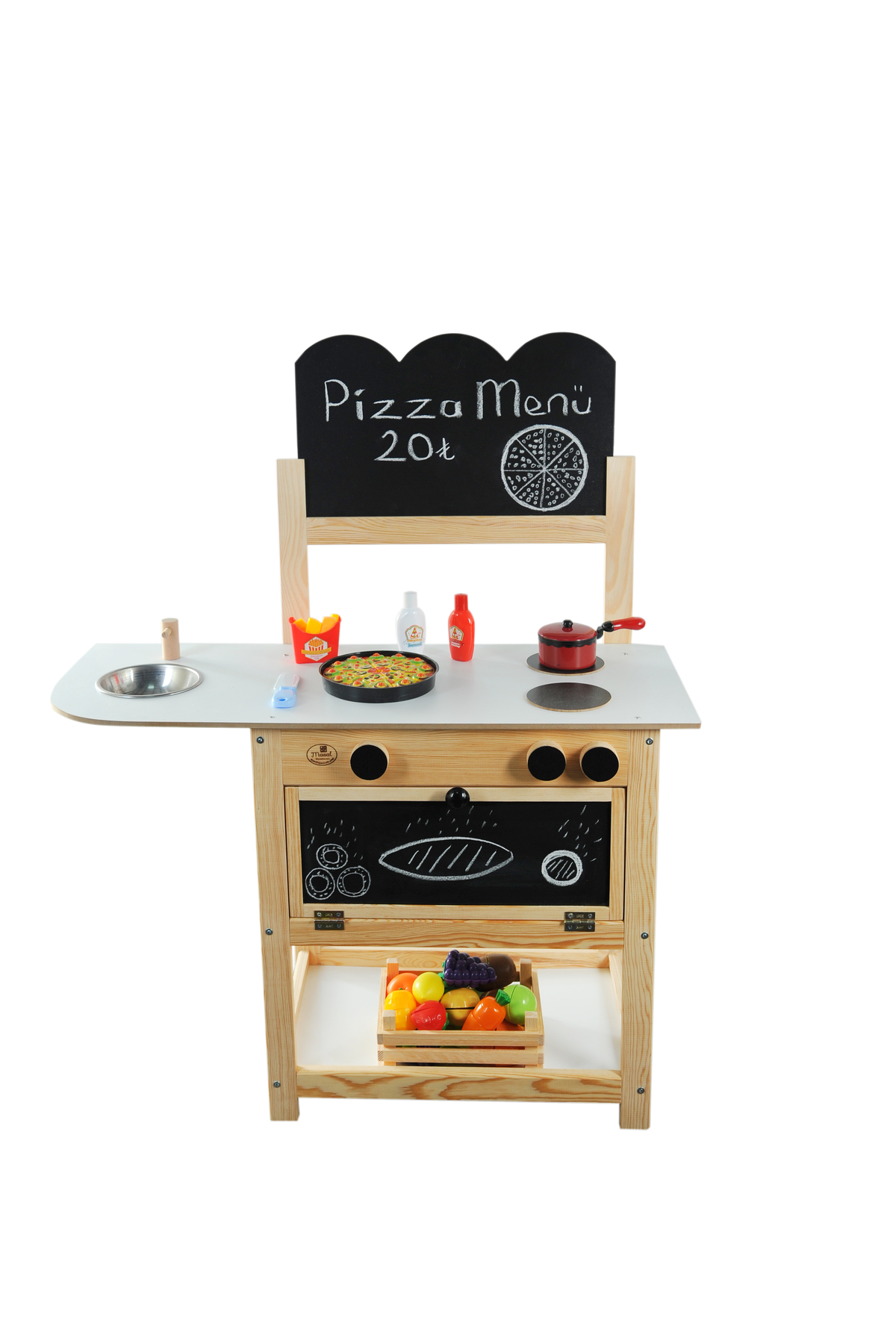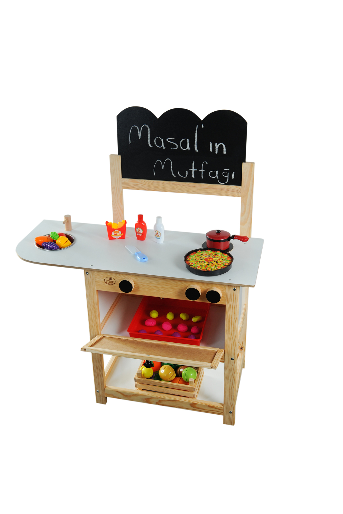 Masal Oyuncak Ahşap Mutfak Seti Çocukların sosyal becerilerini geliştirmesinde yardımcı olan bu ürünün fırın kapağı ve üst bölgesi kara tahtadan yapılmıştır.