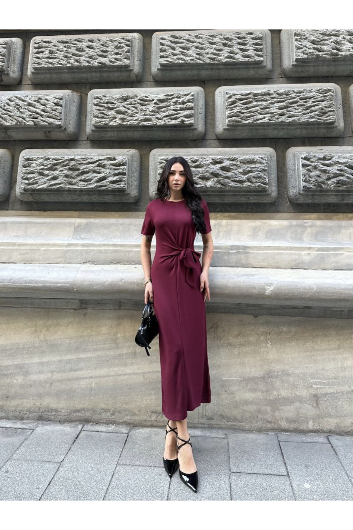 - Bordo renkli modal kumaştan üretilmiş, yaz aylarında serinlik ve konfor sunan bir elbise.