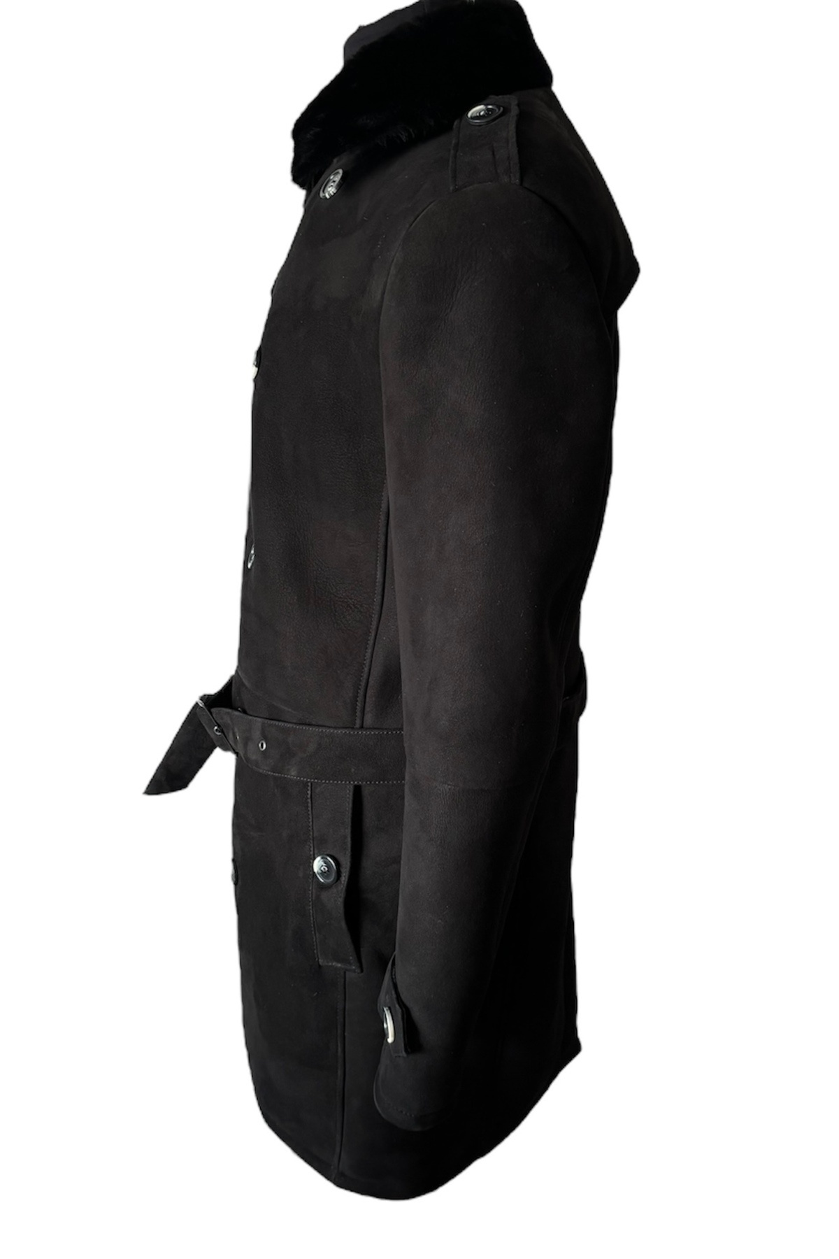 - Siyah hakiki süet koyun kürkü erkek trençkot, şıklığı ve konforu bir arada sunar.