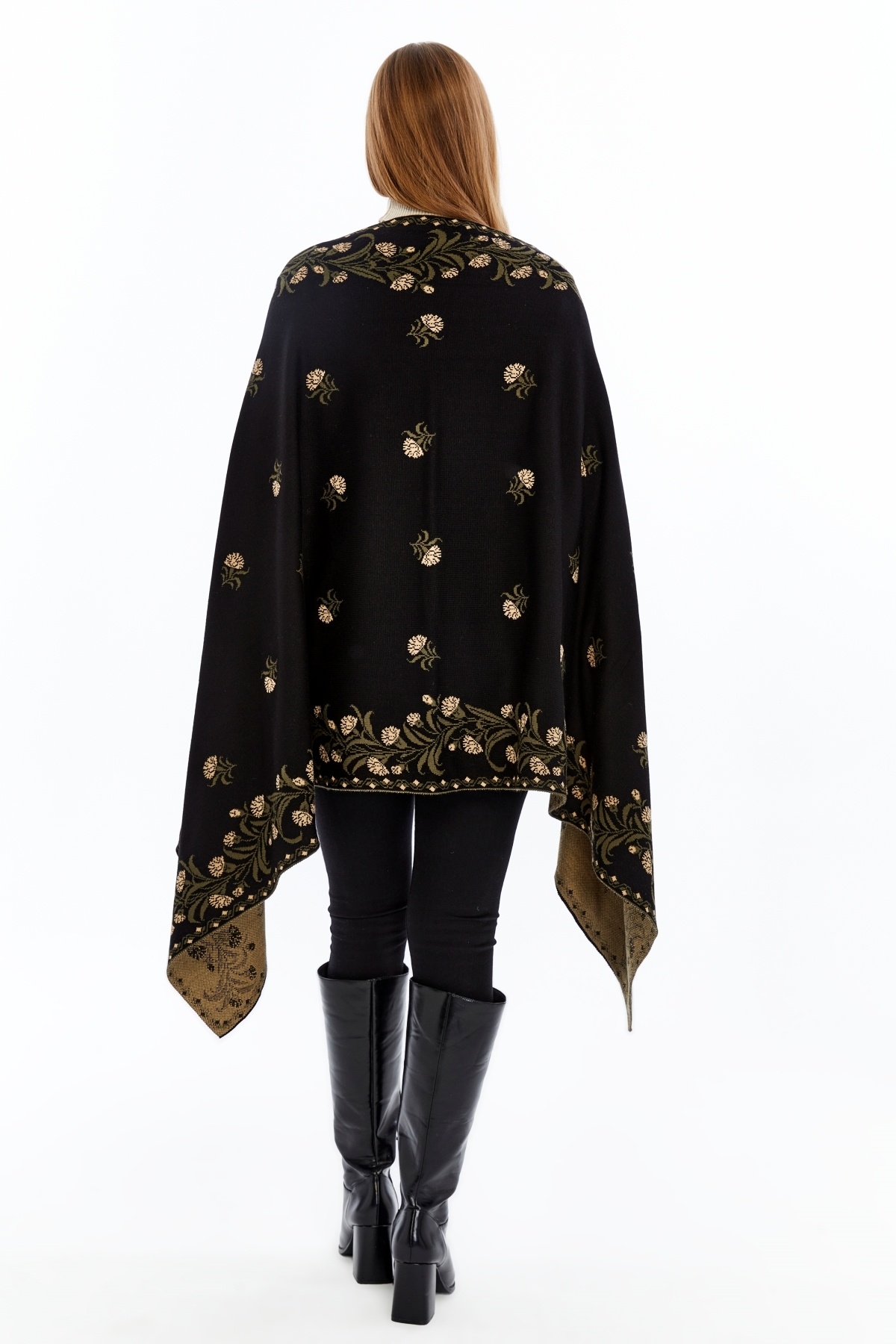 - Zarif karanfil modeliyle tasarlanmış siyah-camel renkli triko omuz şalı, hem günlük kullanım hem de özel günlerde şıklığınızı tamamlar.