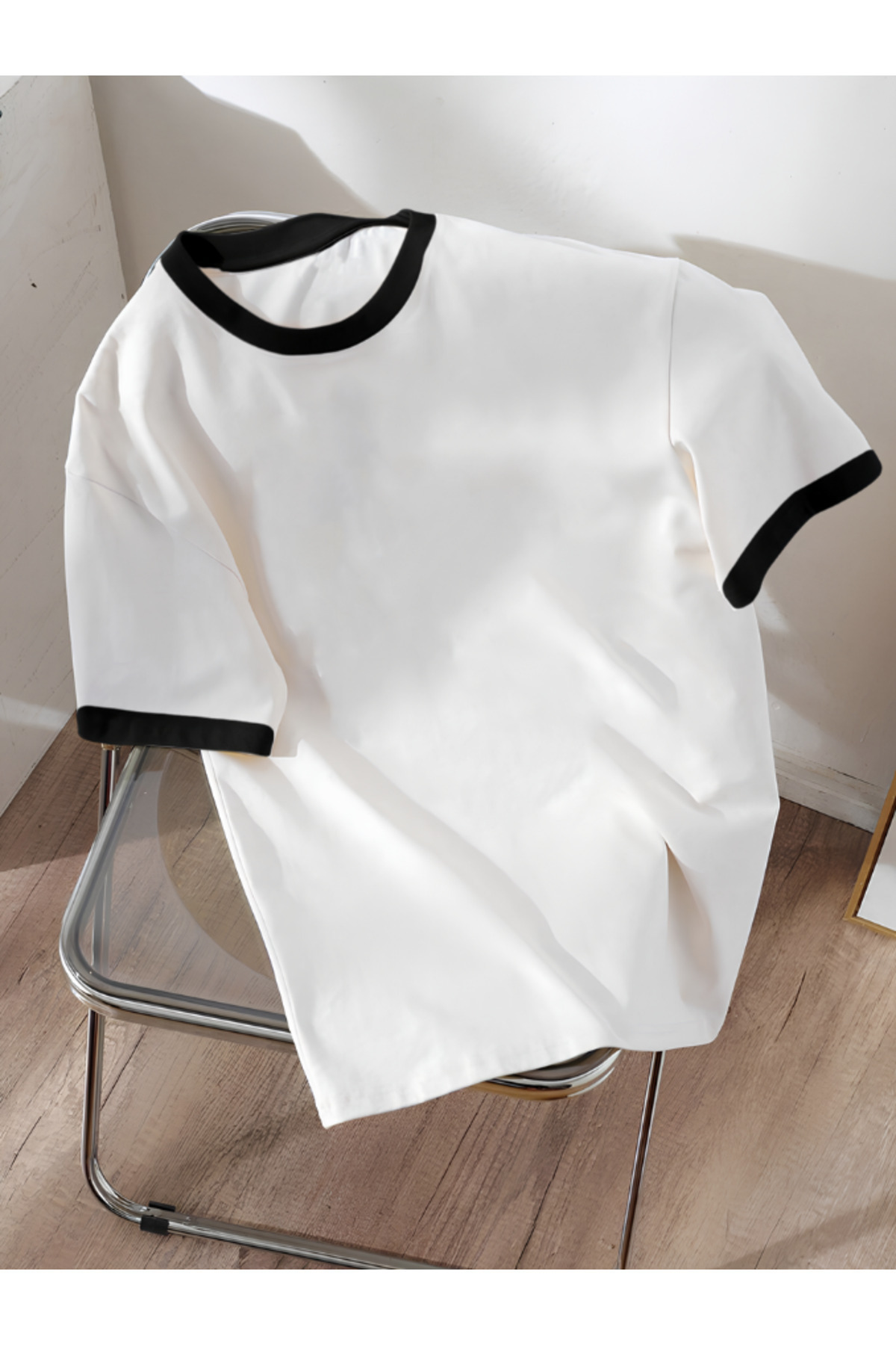 - Unisex tasarımıyla hem erkeklerin hem de kadınların rahatlıkla tercih edebileceği, lacivert beyaz yaka detayına sahip oversize pamuklu t-shirt.