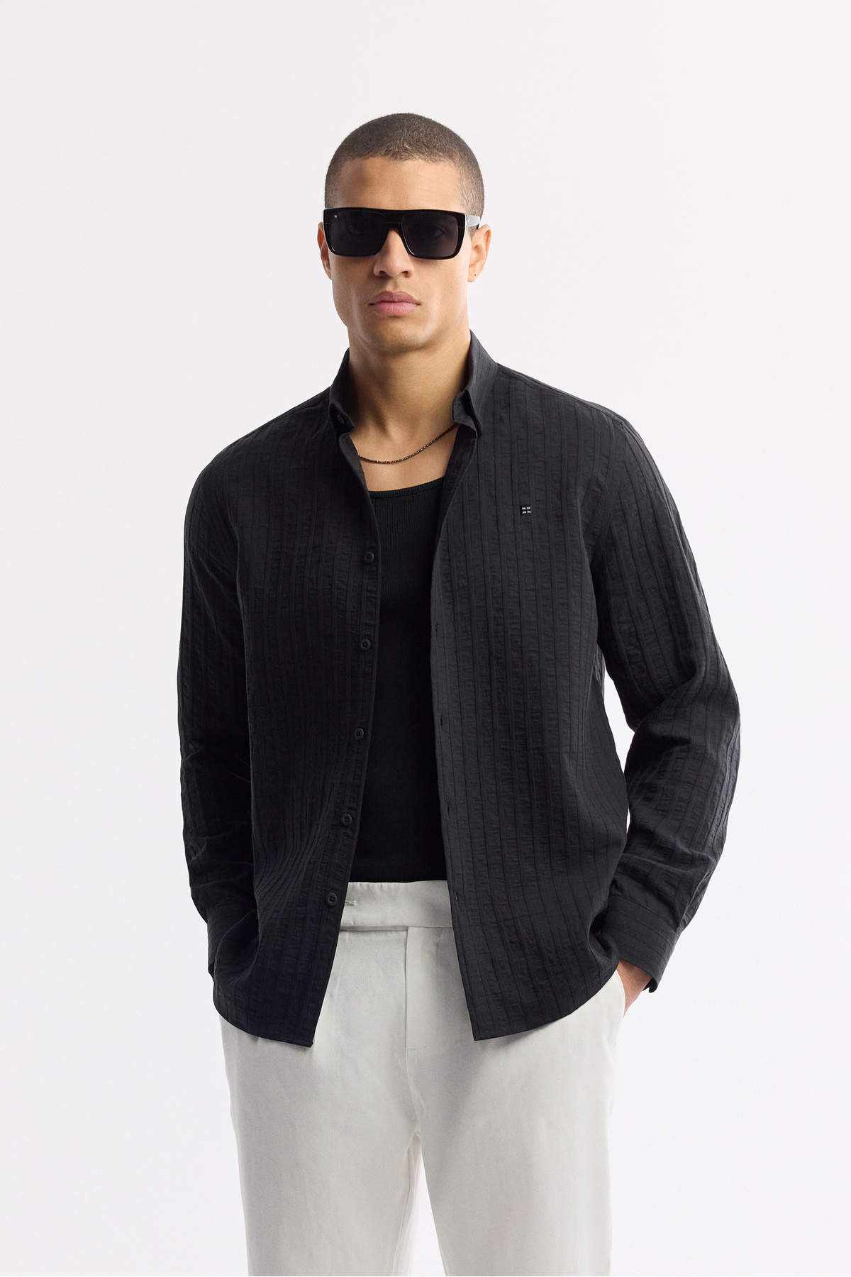 Erkek Siyah Alttan Britli Yaka Çizgili Lyocell Comfort Fit Gömlek A51Y2012