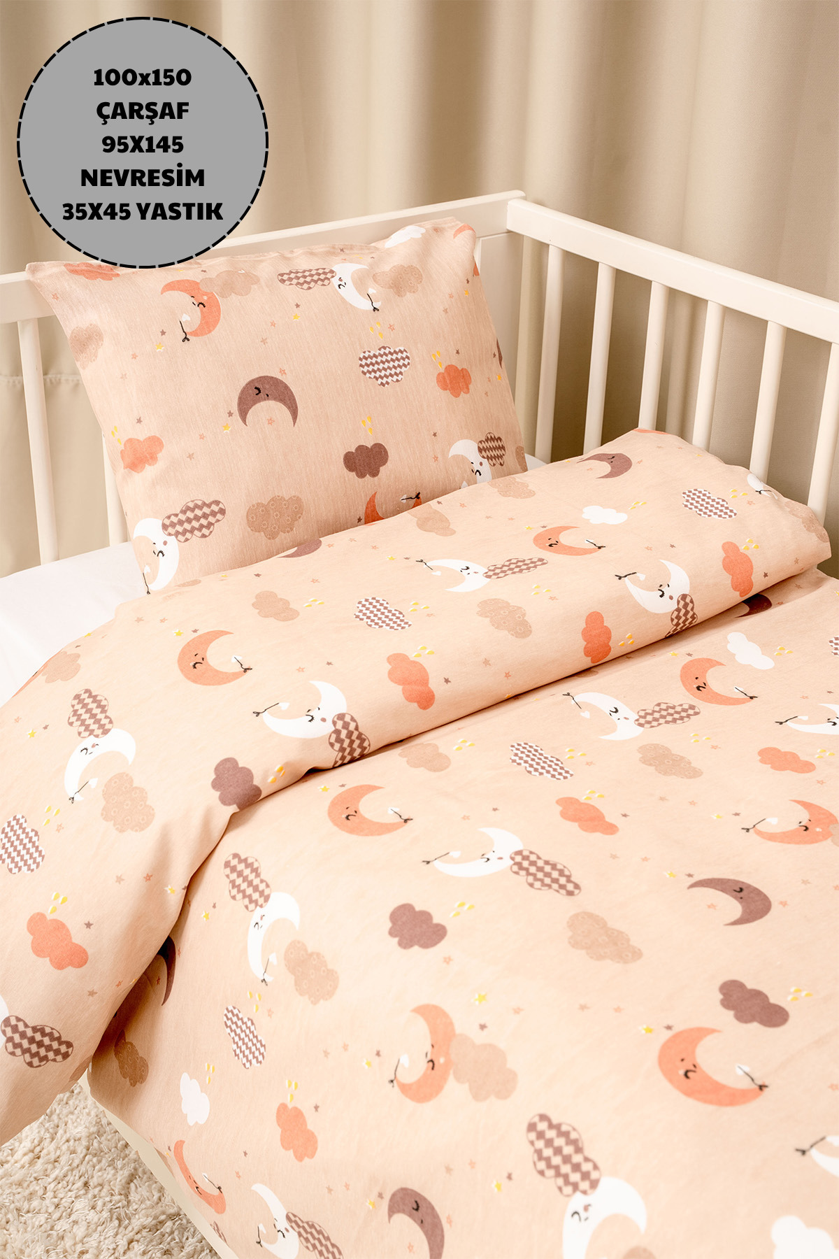 - 95x145 cm boyutlarındaki bu nevresim takımı, standart bebek yatakları için ideal ölçülerdedir.