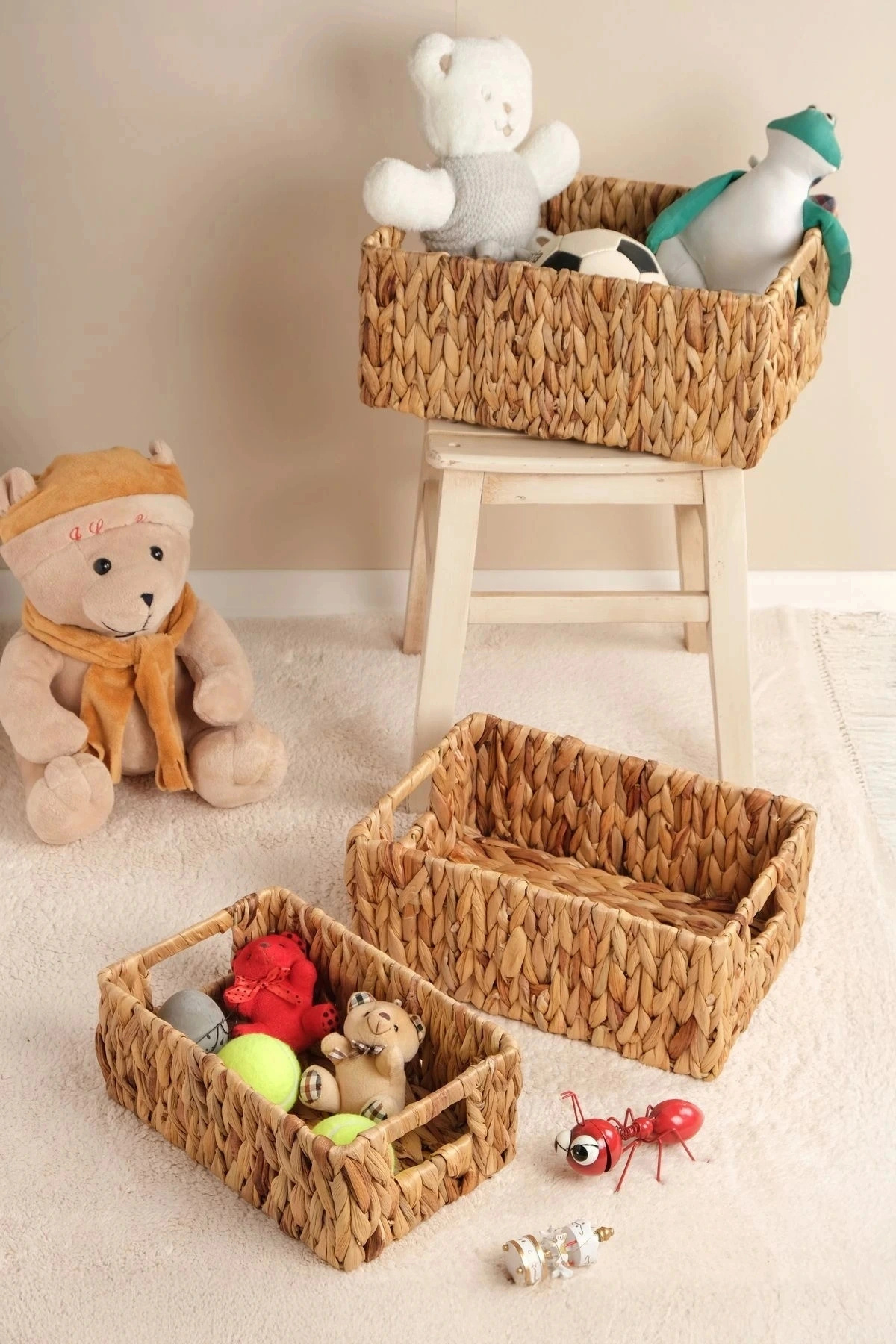 • Lauretta - 3 lü Hasır El Örgüsü Kulplu Dikdörtgen Organizer Sepet Seti