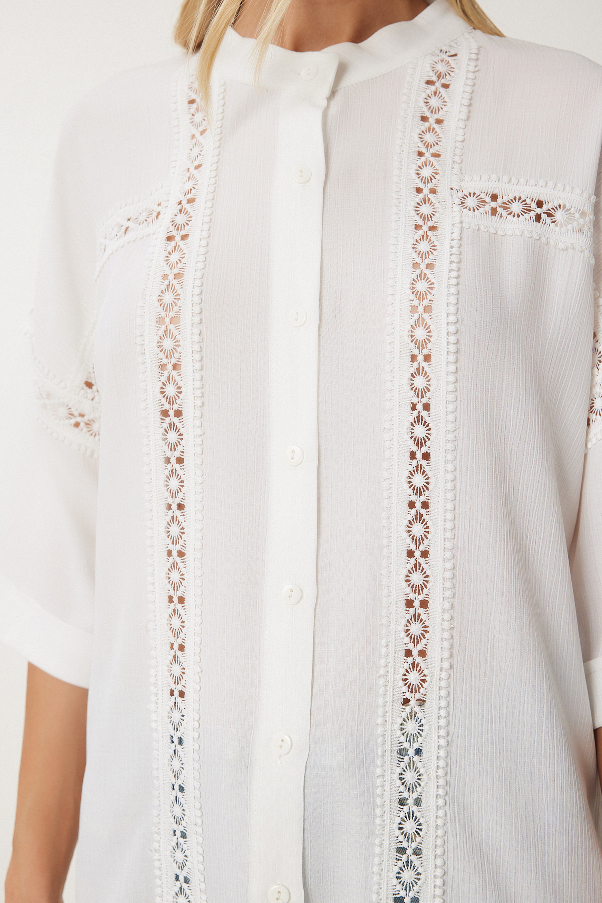 Hakim yaka, düğme kapamalı, yarım kollu, dantel şeritli dokuma gömlek