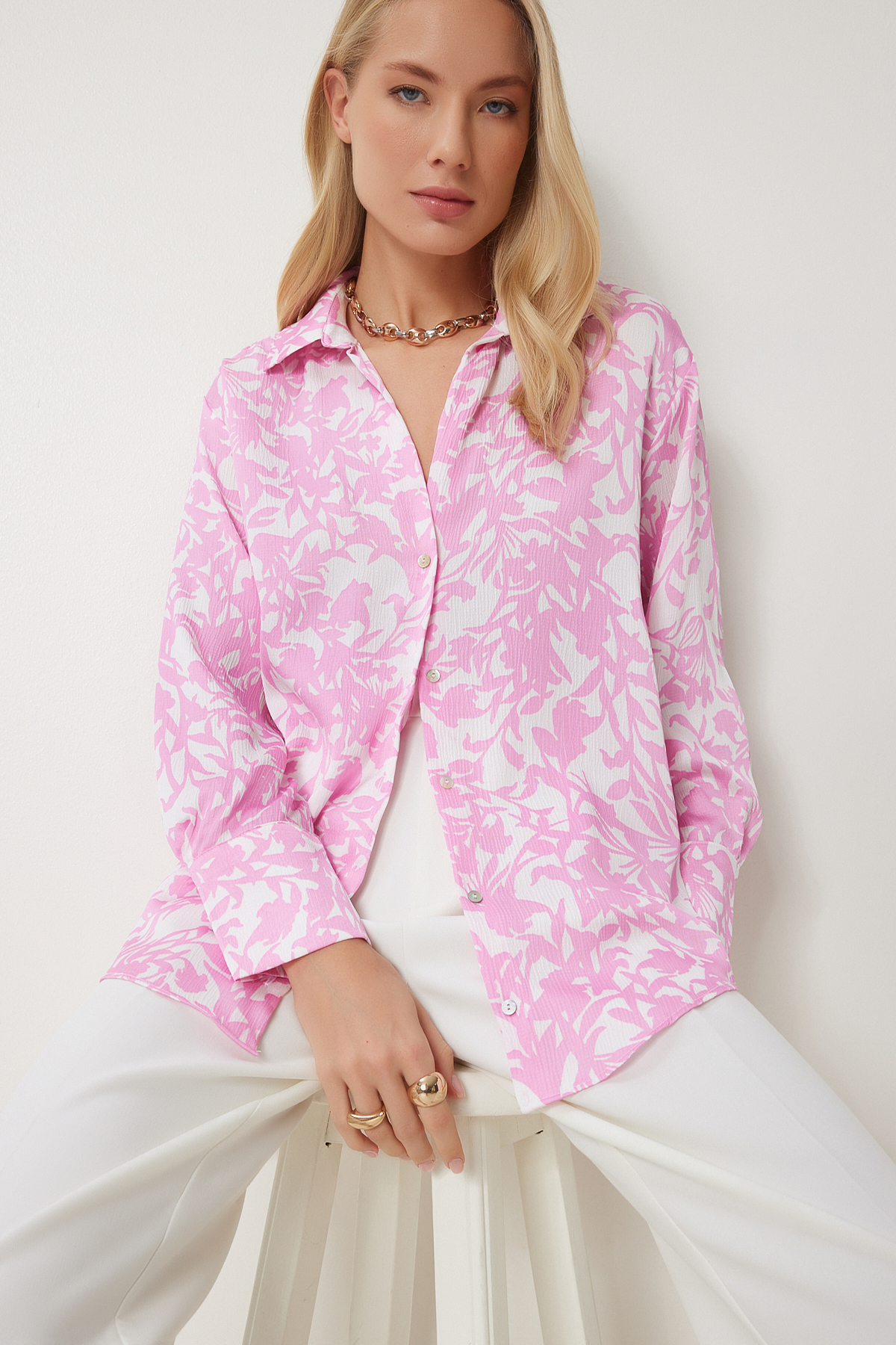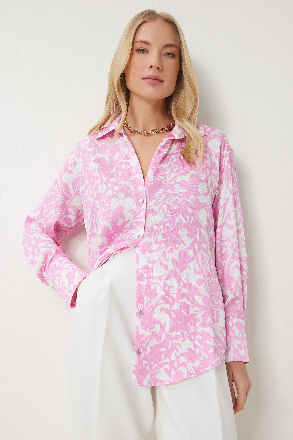 Kadın Pembe Desenli Dökümlü Dokulu Gömlek HM00066