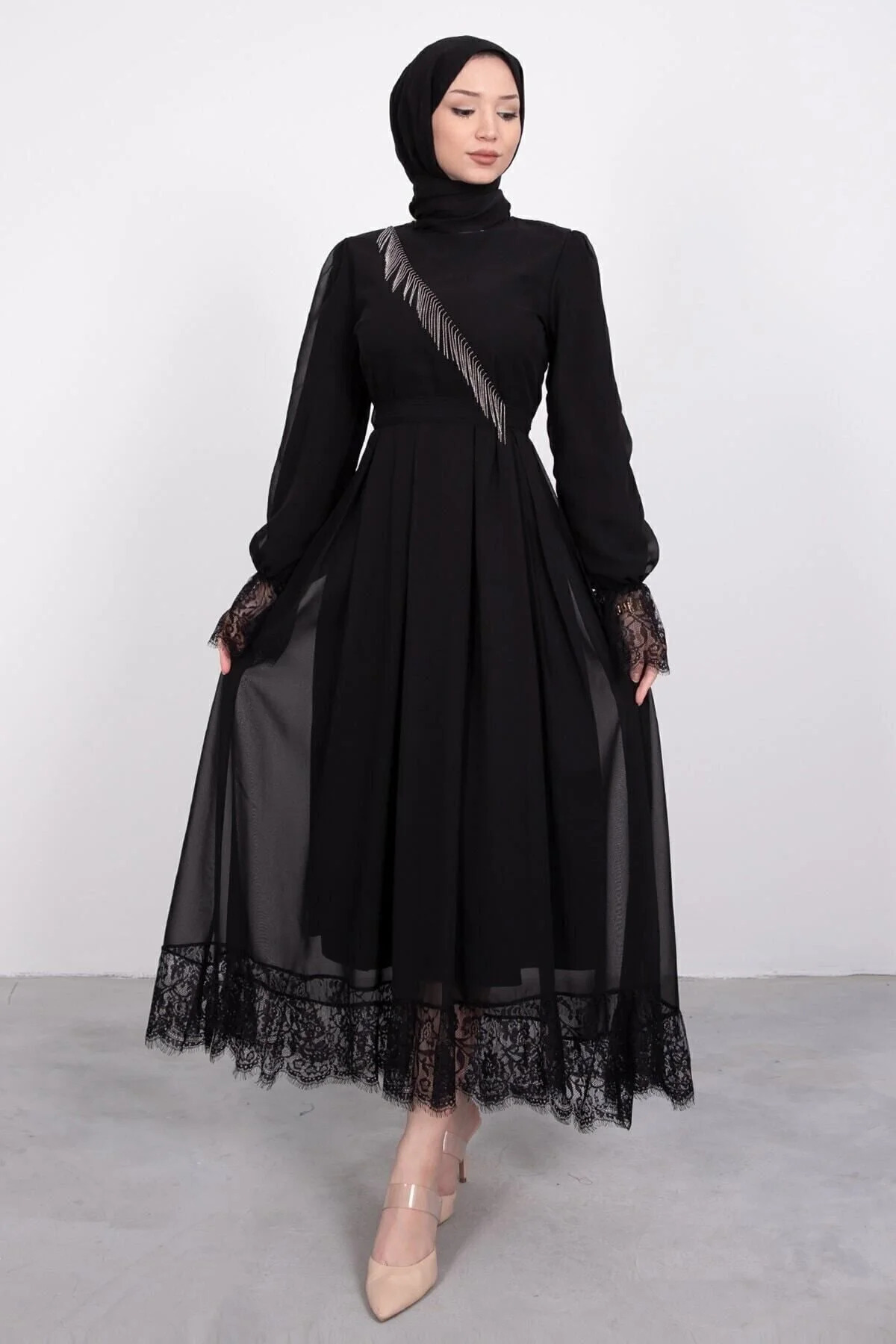 Uzun boyu ile tesettür giyimin vazgeçilmez tercihi olan bu elbise, gündüzden geceye her ortama uyum sağlayacak şekilde tasarlanmıştır.