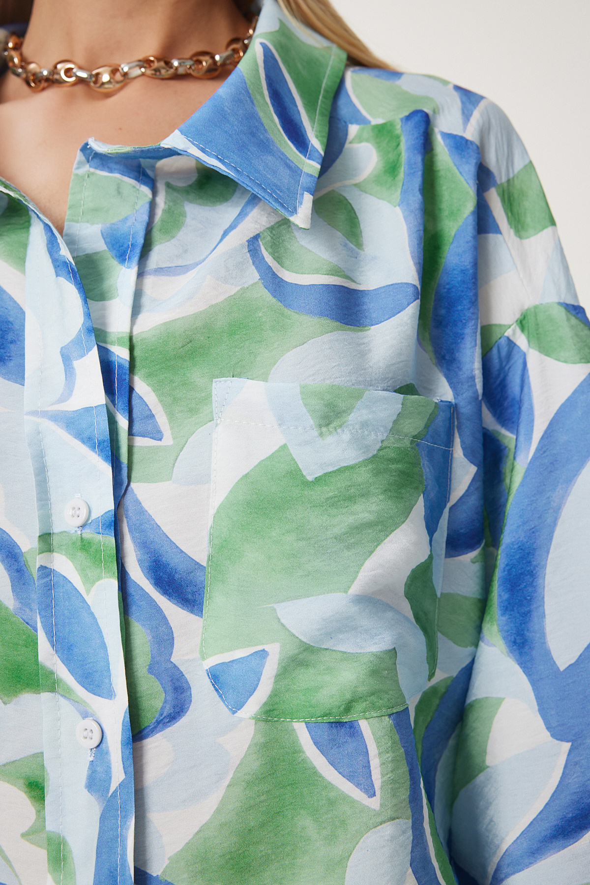 Desenli, düğme kapamalı, düşük omuzlu, ön cepli, dökümlü dokulu dokuma gömlek