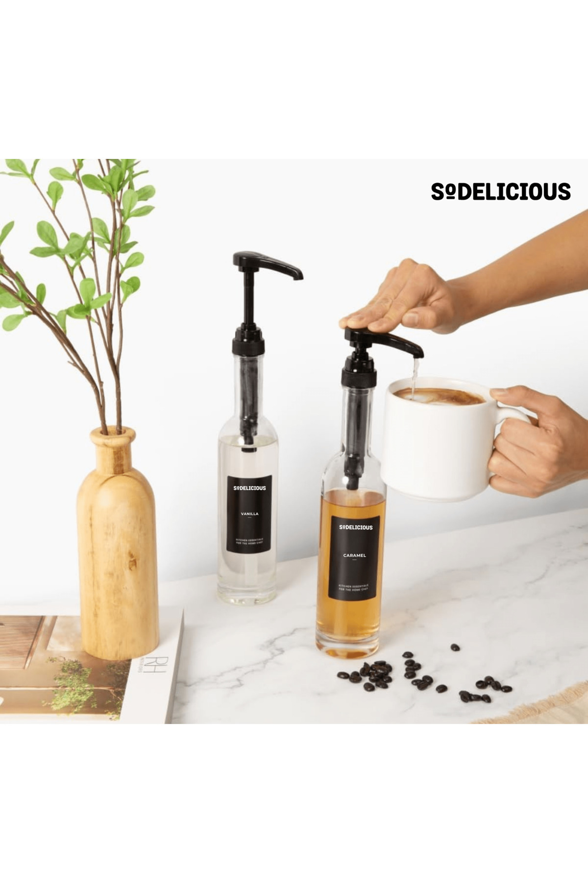 2’li Set | 250ml Pompalı Cam Şurup Şişesi- Kahve , 18 Çeşit Siyah Etiket + Silikon Huni Hediyeli