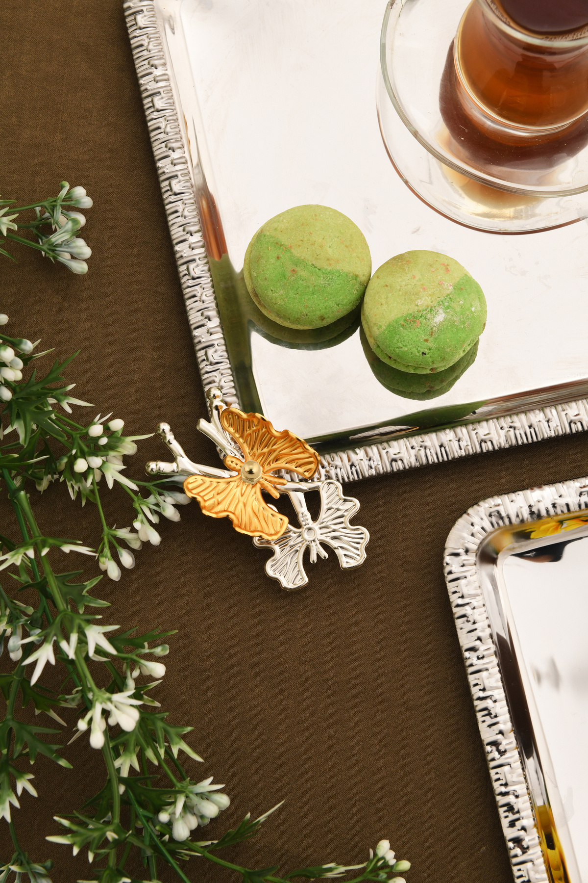 Modern ve şık tasarımıyla dikkat çeken Maren Paslanmaz Kare Desenli Kelebek Detaylı Sunum Tepsisi, gümüş rengiyle sofralarınıza zarif bir dokunuş katıyor.