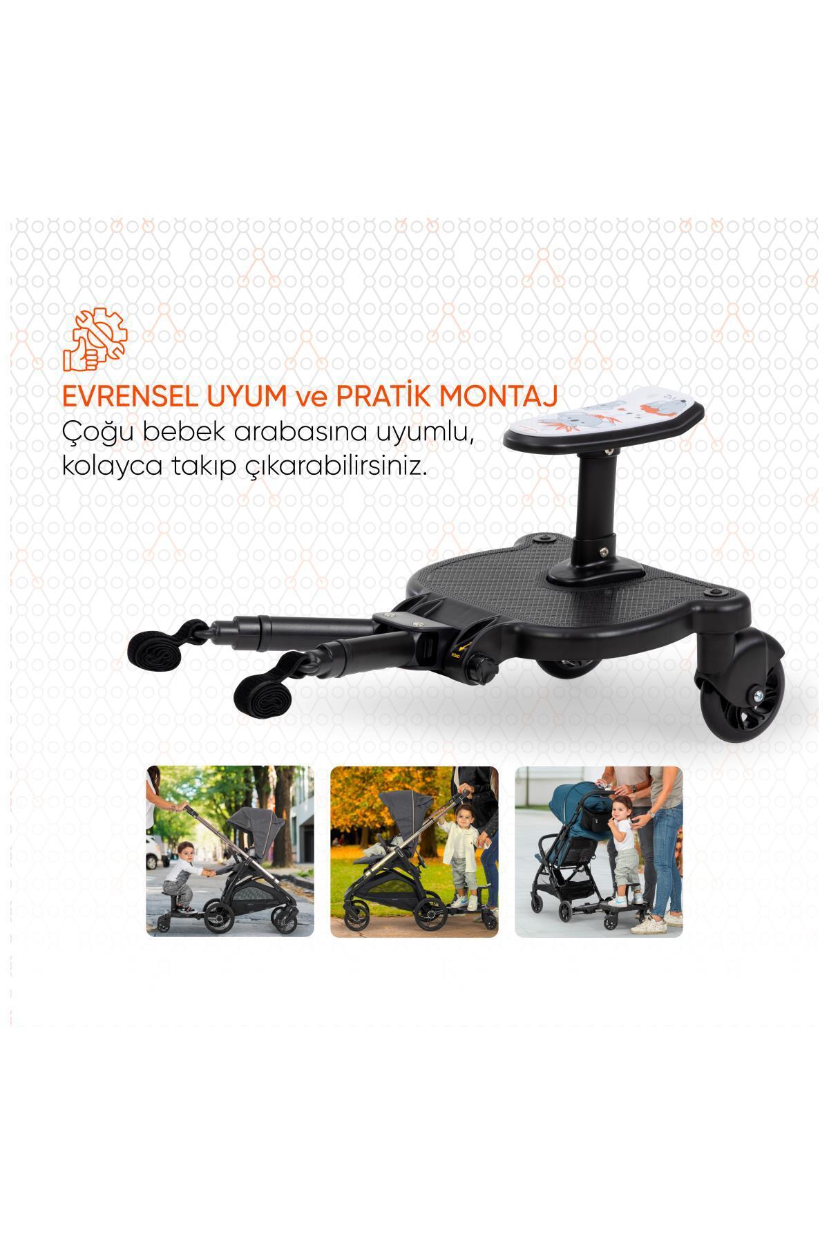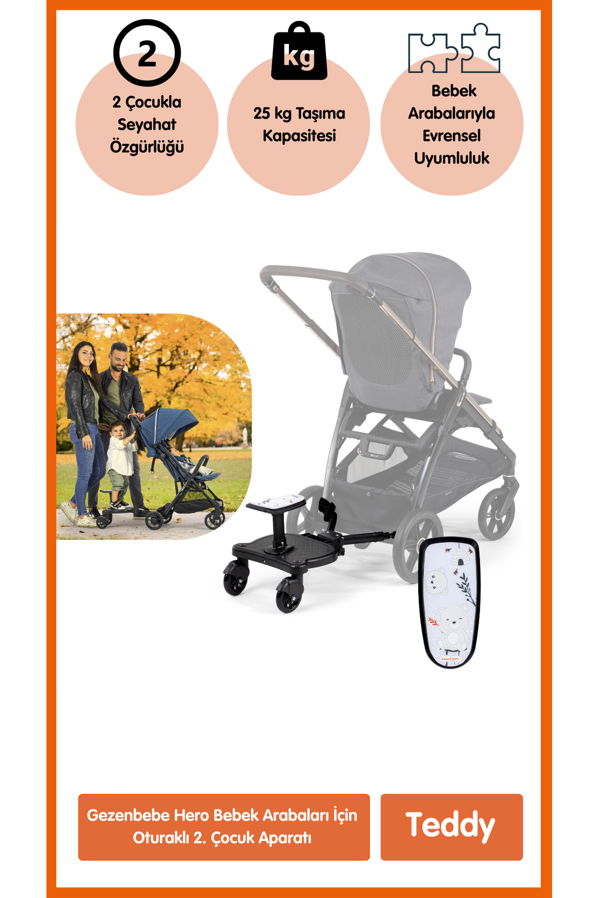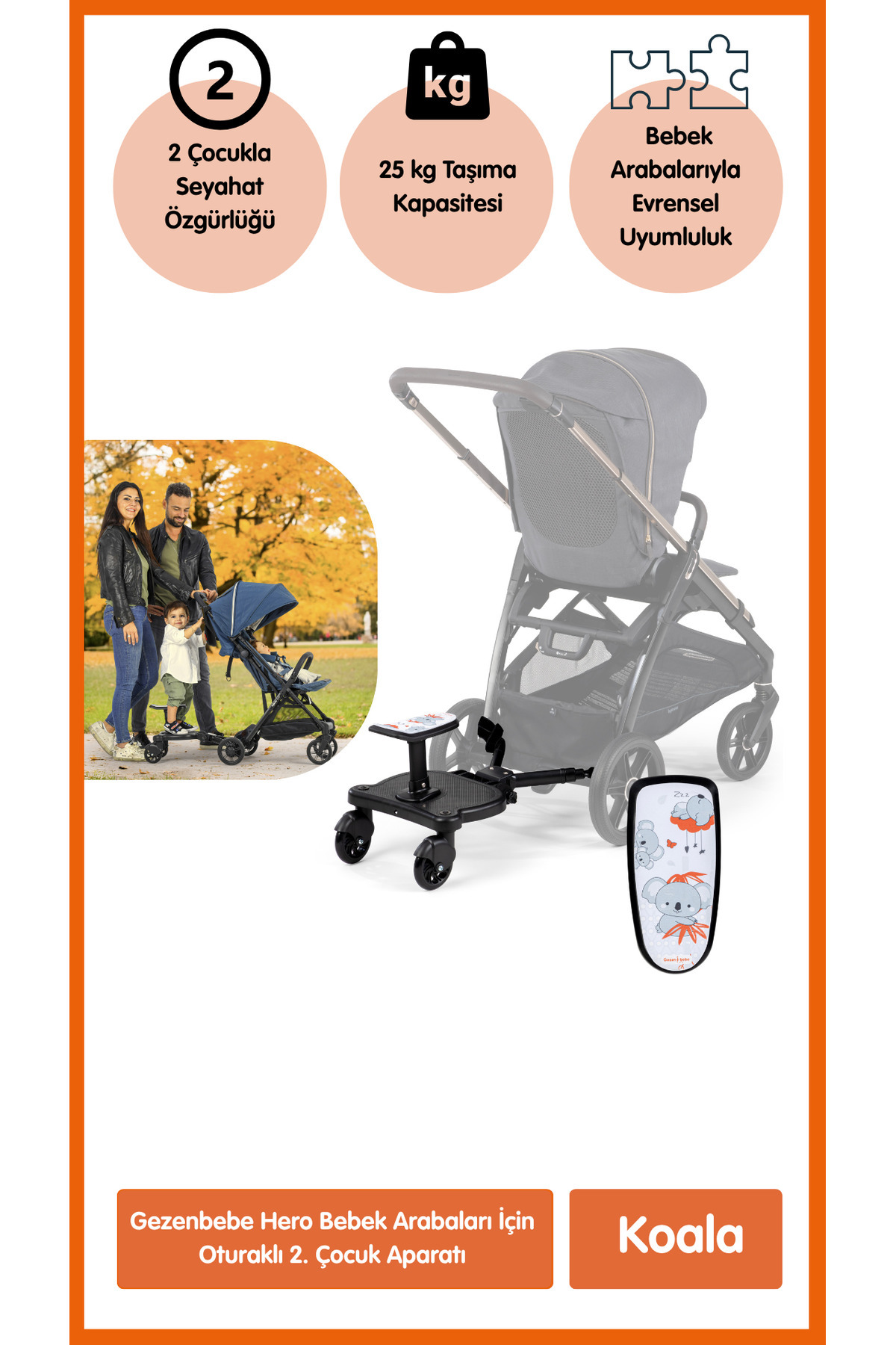 Gezenbebe Koala Oturaklı İkinci Çocuk Aparatı, iki çocuğunuzla yapılan yürüyüş ve seyahatlerde en pratik çözümdür. 2’si 1 arada tasarımıyla hem ayakta basamak hem de oturaklı kullanım imkânı sunar. Dayanıklı malzeme yapısı uzun ömürlü kullanım sağlarken, ergonomik tasarım çocuğunuza konfor sağlar. Kolayca takılıp çıkarılabilen portatif yapısı sayesinde her zaman yanınızda taşıyabilirsiniz. İnglesina ve Doona bebek arabalarıyla tam uyumlu olması sayesinde güvenli ve stabil kullanım sunar. Kompakt tasarımı ve oturaklı avantajıyla öne çıkan bu aparat, parkta, alışverişte veya seyahatte iki çocuğu ile pratik çözüm arayan aileler için idealdir.
