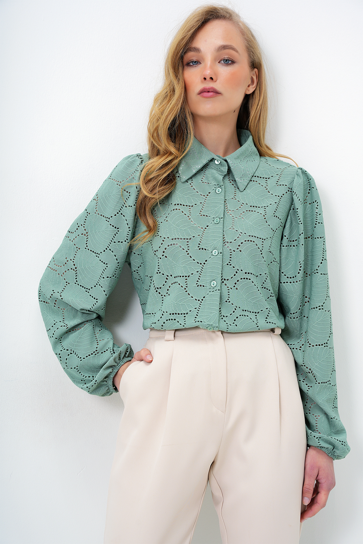 Kadın Yeşil Güpür Dokuma Premıum Gömlek ALC-X4366
