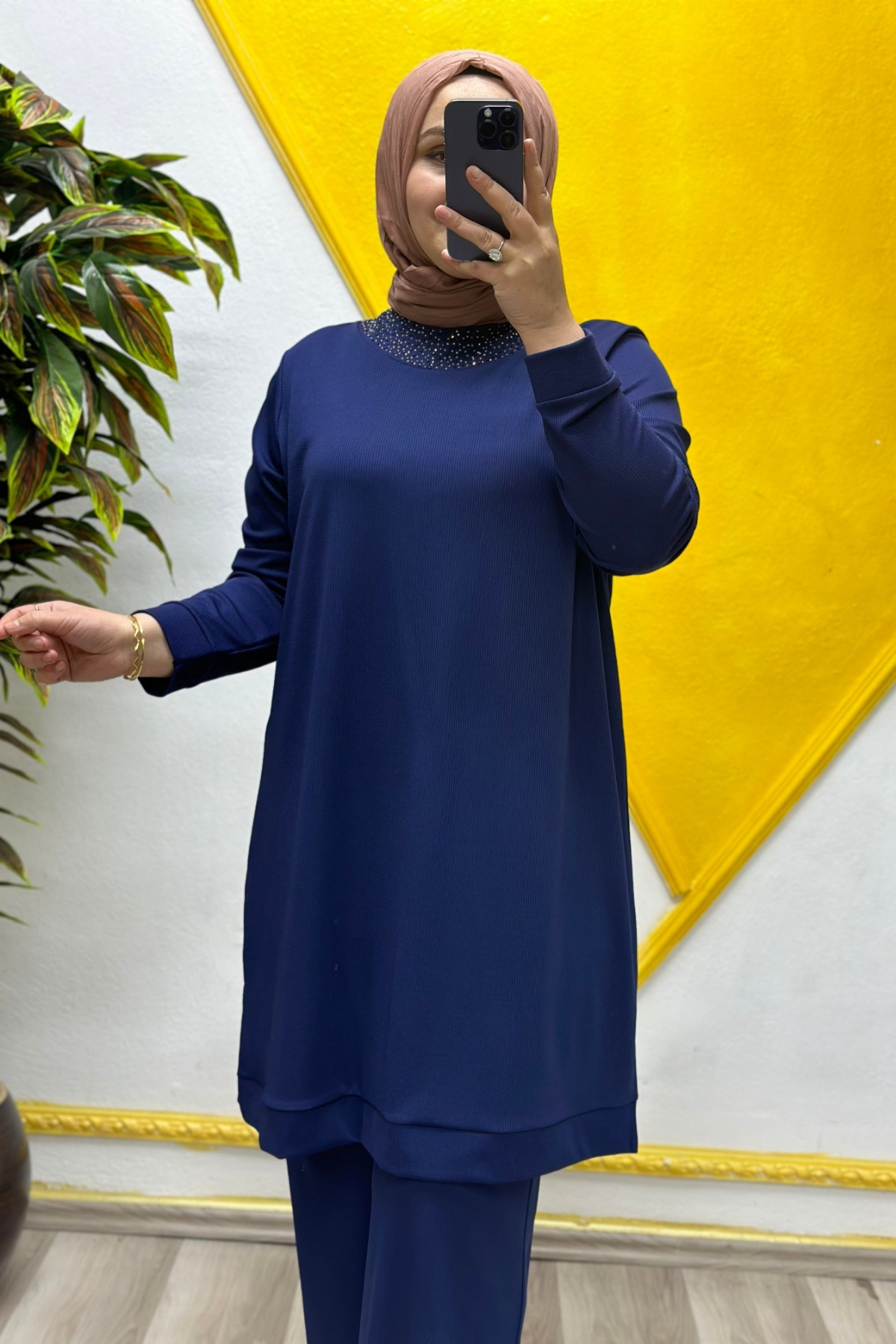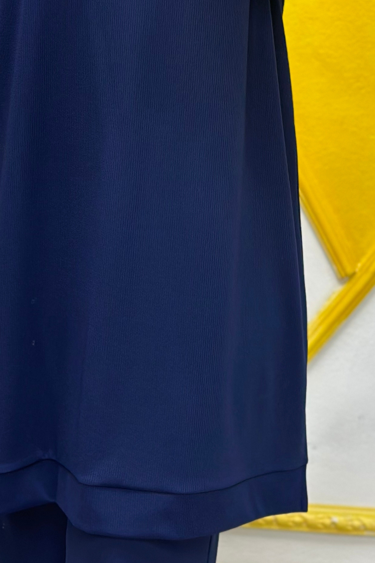 - Lacivert rengiyle şıklığı ve zarafeti bir arada sunan bu takım, her ortamda göz alıcı bir görünüm sağlar.