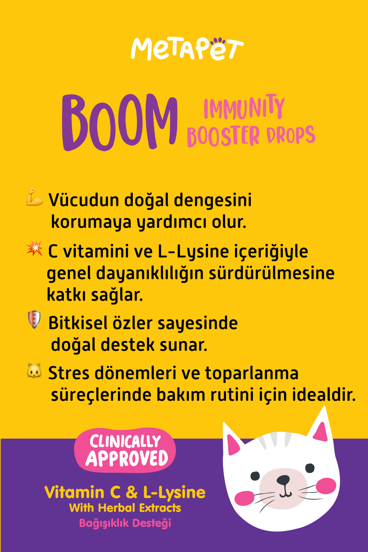 Metapet Kediler için Bağışıklık Sistemini Destekleyici Damla, kedinizin bağışıklık sistemini destekleyen özel formülümüz ile genel sağlık durumunun korunmasına yardımcı olur.