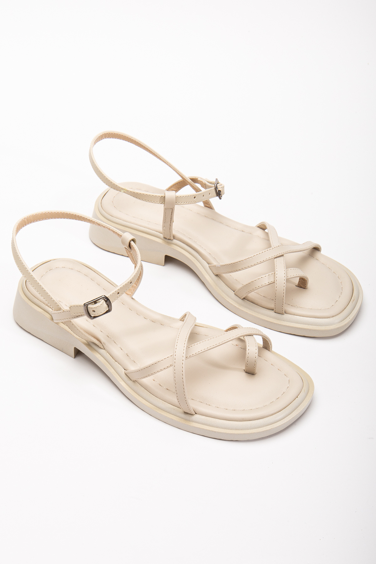 Ten Krem Bej Mat Deri Bantlı Parmak Arası Bantlı İnce Taban Sandalet