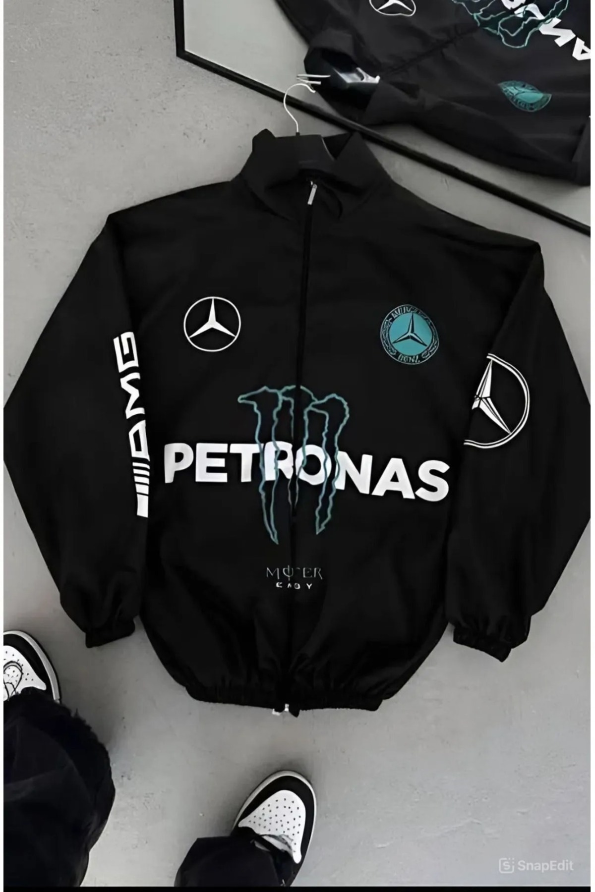 Unisex Paraşüt Kumaş Oversize Baskılı Siyah Rüzgarlık Yağmurluk