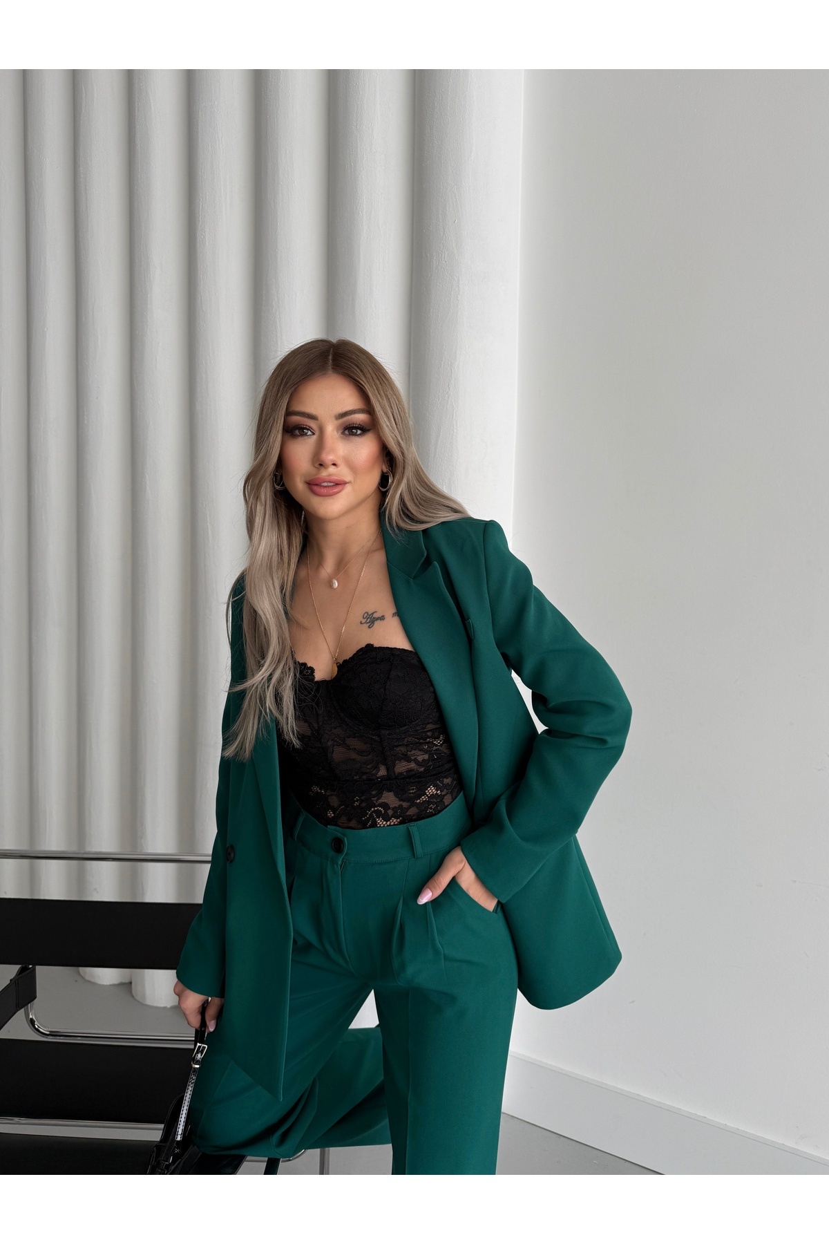 Kadın Zümrüt Yeşil Blazer Ceket Palazzo Pantolon Takım Elbise