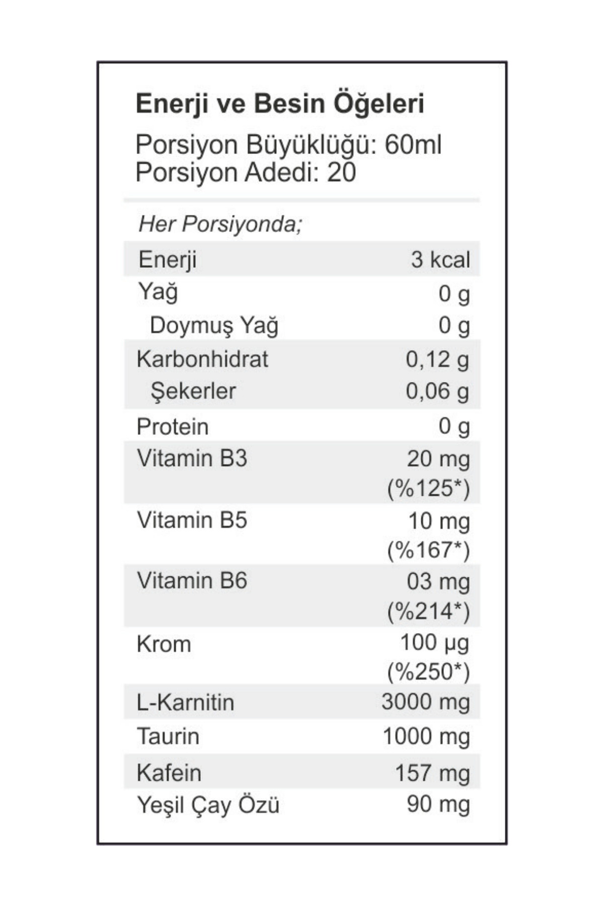 Bu gıda takviyesi yeterli ve dengeli bir diyetle birlikte tüketilmedir. Yüksek miktarda kafein içerir. Çocuklar, hamile ve emziren kadınlar için tavsiye edilmez.