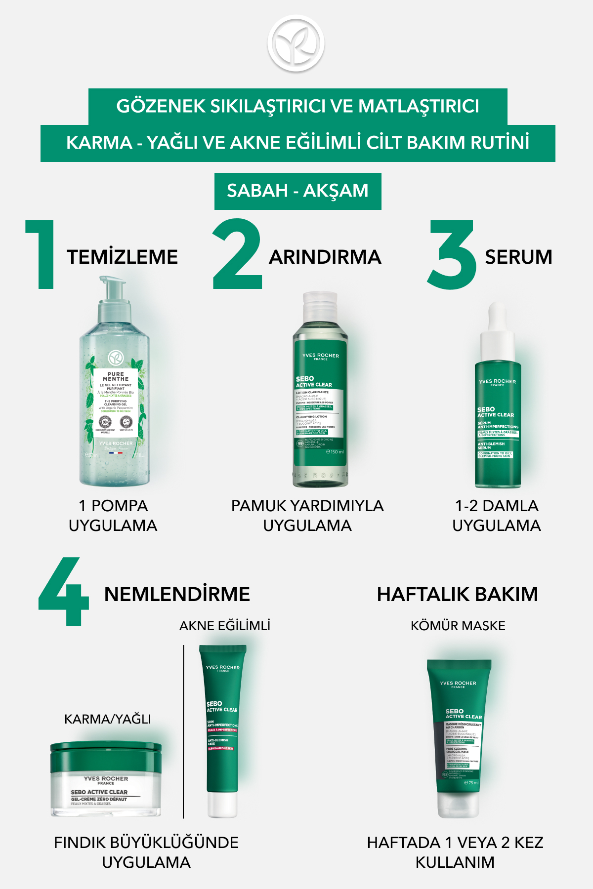 --Rutin Önerisi-- Karma/ Yağlı Cilt Rutini:1-TemizlemeYüz Yıkama Jeli - Karma, Yağlı, Akne/ Eğilimli Cilt / Pure Menthe ile başlayın.2-ArındırmaTonik- Gözenek Sıkılaştırıcı / Karma ve Yağlı Cilt /Sebo Active Clear ile devam ediniz.3-BakımSon aşama olarak önce Serum – Yağ Dengeleyici / Karma ve Yağlı/ Akne Eğilimli Cilt/ Sebo Active Clear ve Nemlendirici - Karma ve Yağlı Cilt/Sebo Active Clear ile bitiriniz.