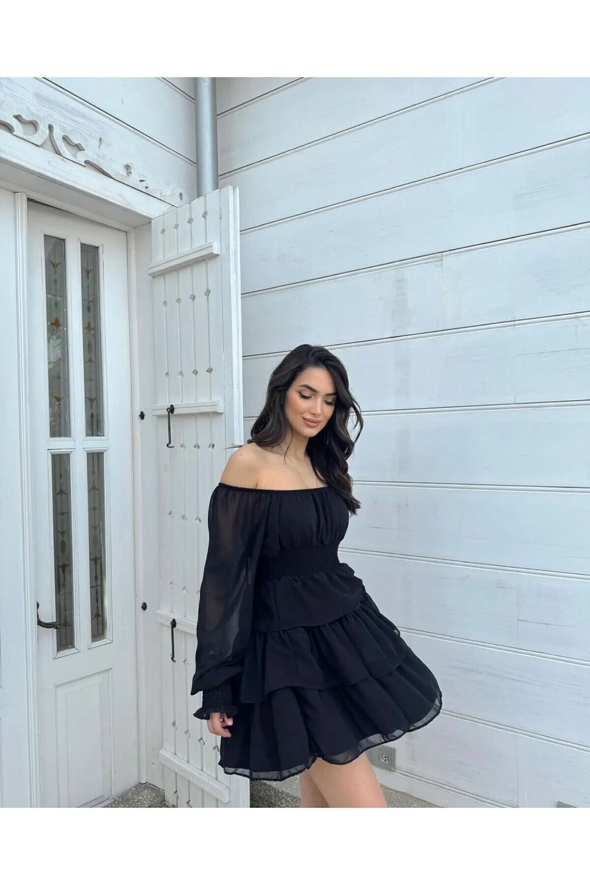 YAKASI LASTİKLİ DÜŞÜK OMUZLU , BELİ GİPELİ , UZUN KOLLU KAT KAT VOLAN DETAYLI, DAVET,MEZUNİYET,PARTİLERDE TERCİH EDEBİLECEĞİNİZ ÇOK ŞIK TASARIM BİR ELBİSE 4 FARKLI RENK SEÇENEĞİ İLE HER ZEVKE UYGUN