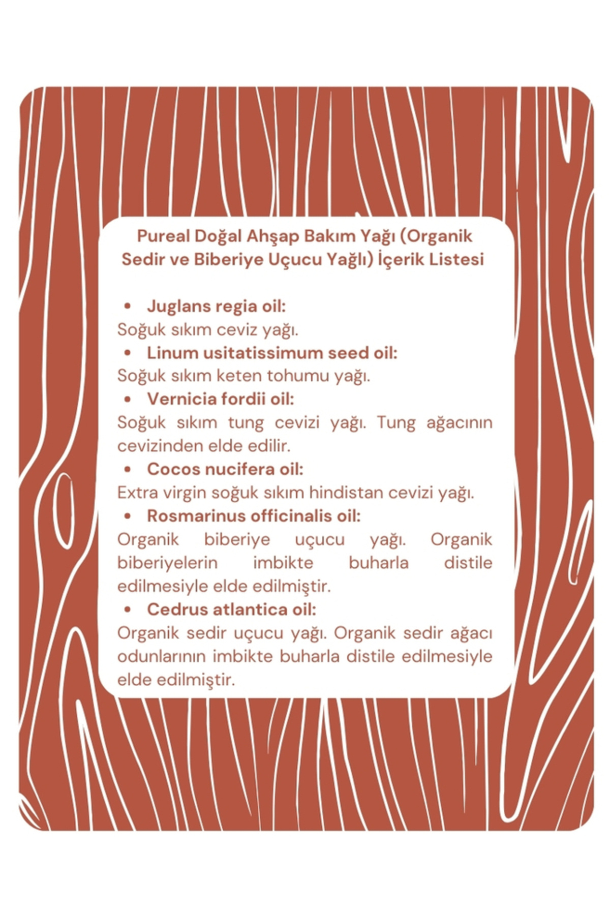 Tüm ahşap yüzeyler için ( gıda ile temas eden ahşaplar dahil) uygun olan ve %100 doğal içeriğe sahipPureal Doğal Ahşap Bakım Yağı, içeriğinde bulunan ceviz, tung, keten tohumu ve hindistan cevizi yağı ile ahşabı parlatır, besler ve bakım yapar