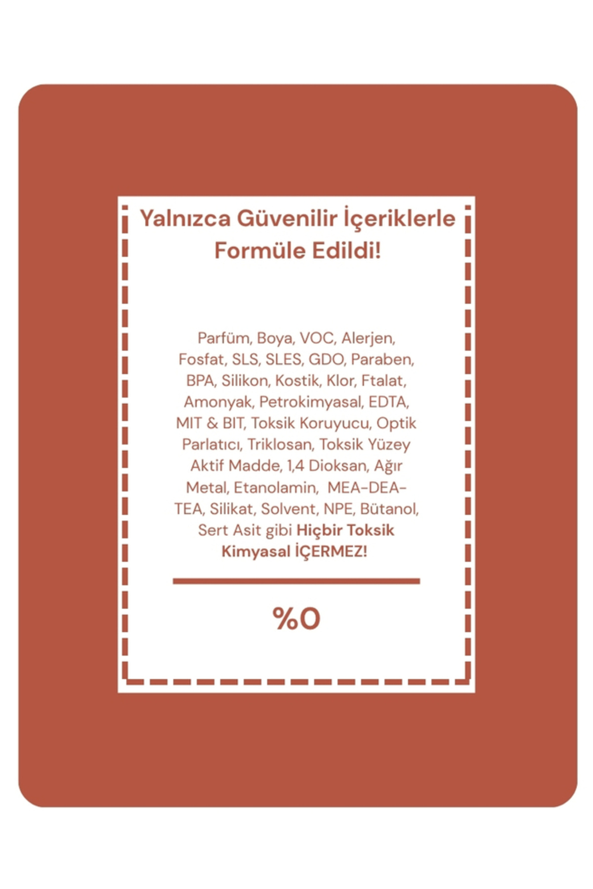 Ceviz Yağı + Keten Tohumu Yağı + Tung Yağı ve Hindistan Cevizi Yağı ile Hazırlanmış Özel Formül Boya, parfüm, koruyucu ve ftalat gibi hiçbir kimyasal içermez