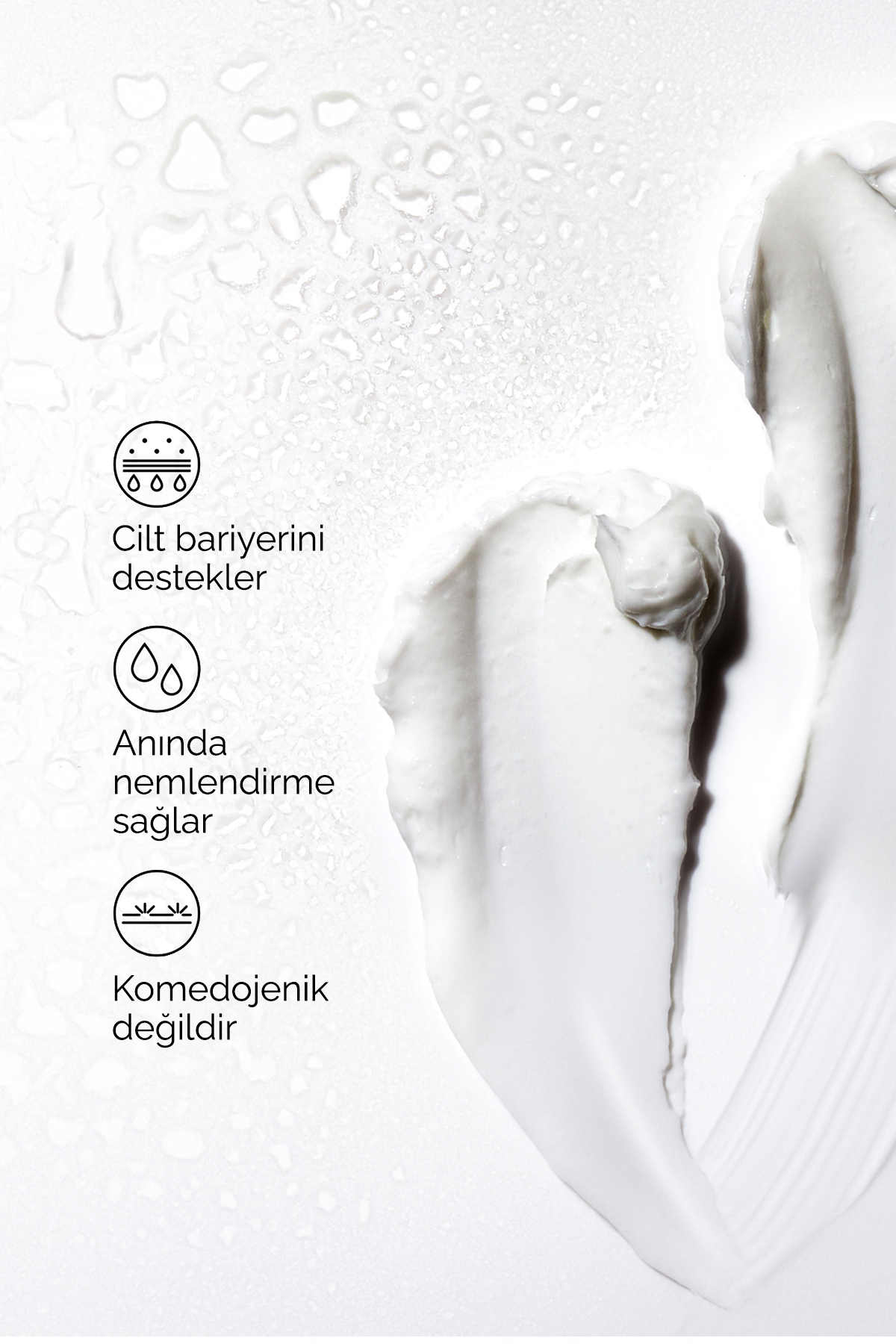 Bu nemlendirici, cildin kaybettiği nemi geri kazanmasına ve cildin bariyerini güçlendirmeye yardımcı olarak anında ve uzun süre kalıcı etki sağlar. İçeriğindeki hyalüronik asit, cildin nem tutma kapasitesini artırarak cilde gün boyu etkili nemlendirme sunarken