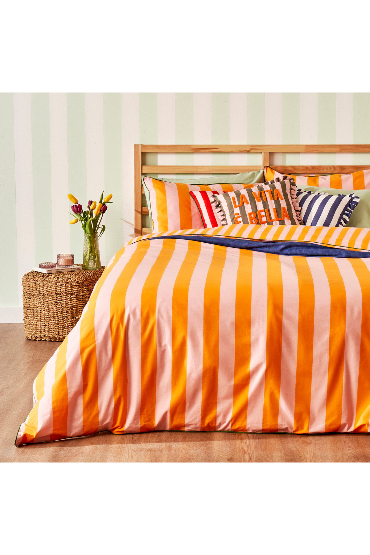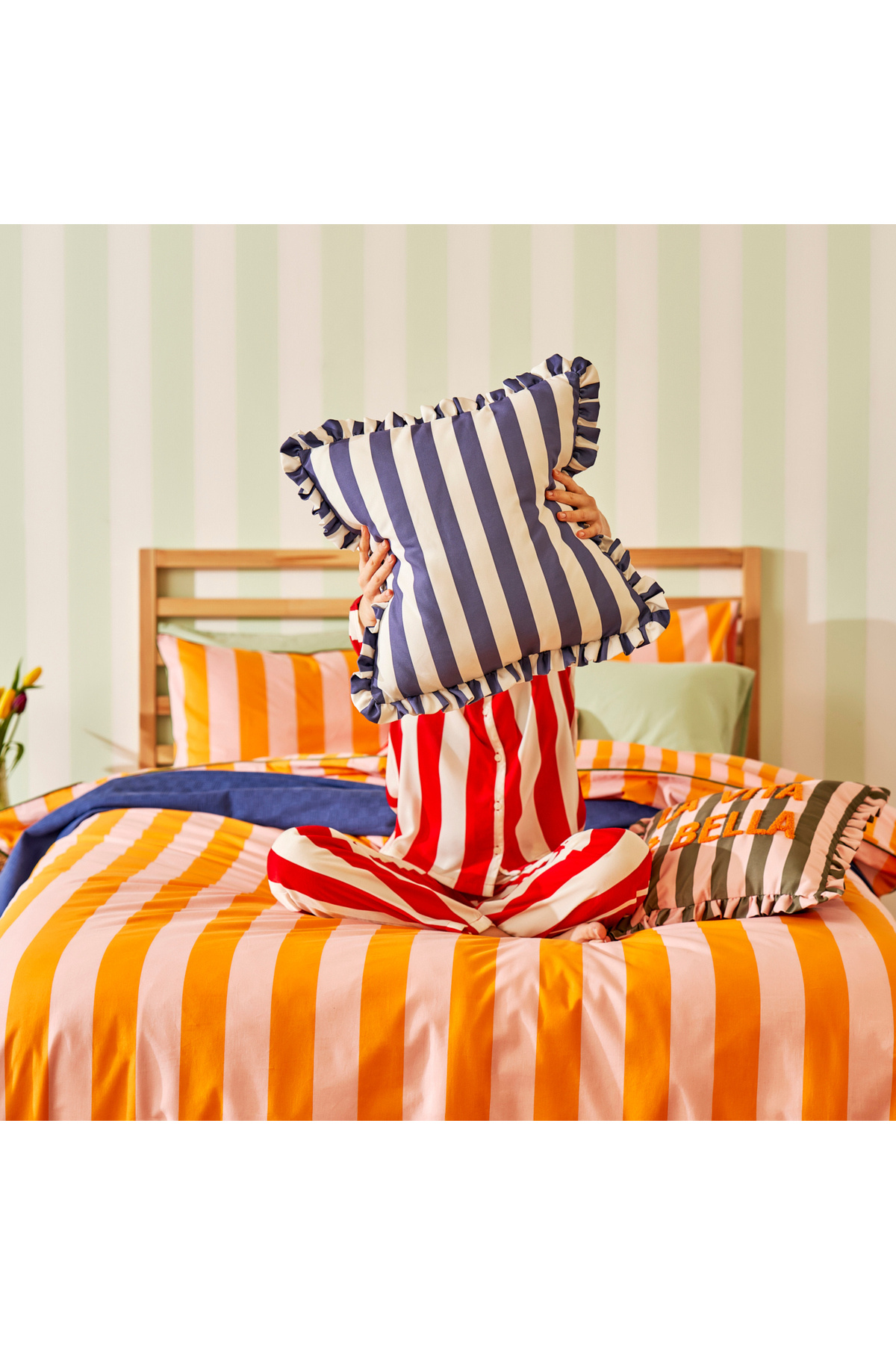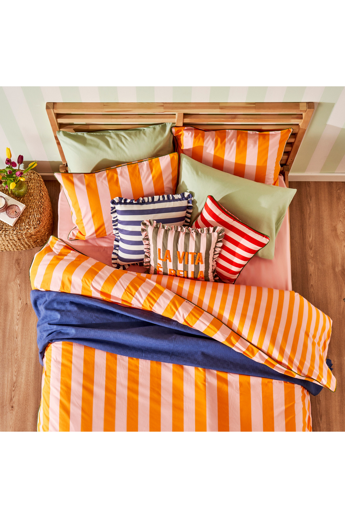 Nevresimin her iki yüzü farklı raporlarda çizgili şekilde tasarlanmıştır, böylece dilediğiniz tarafa çevirerek dekorasyonunuzu kolayca değiştirebilirsiniz.