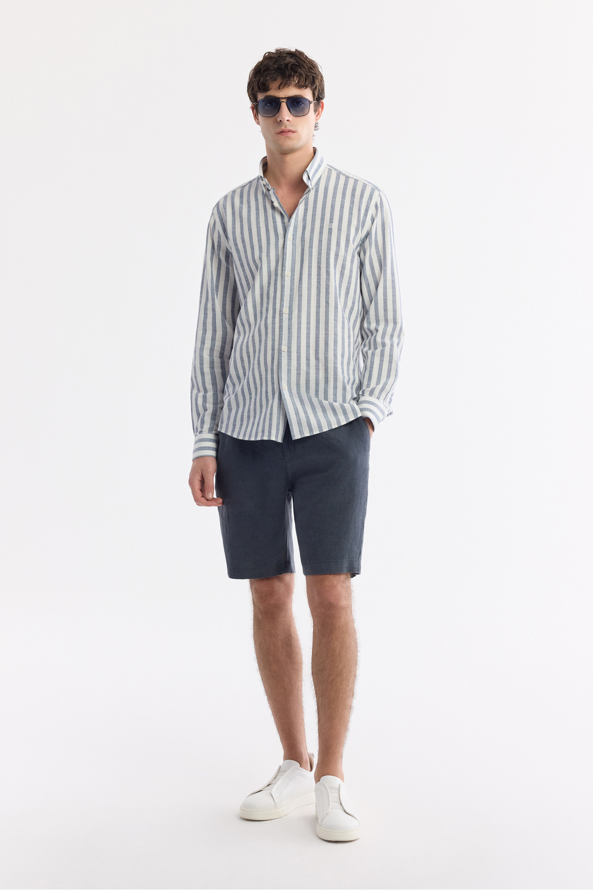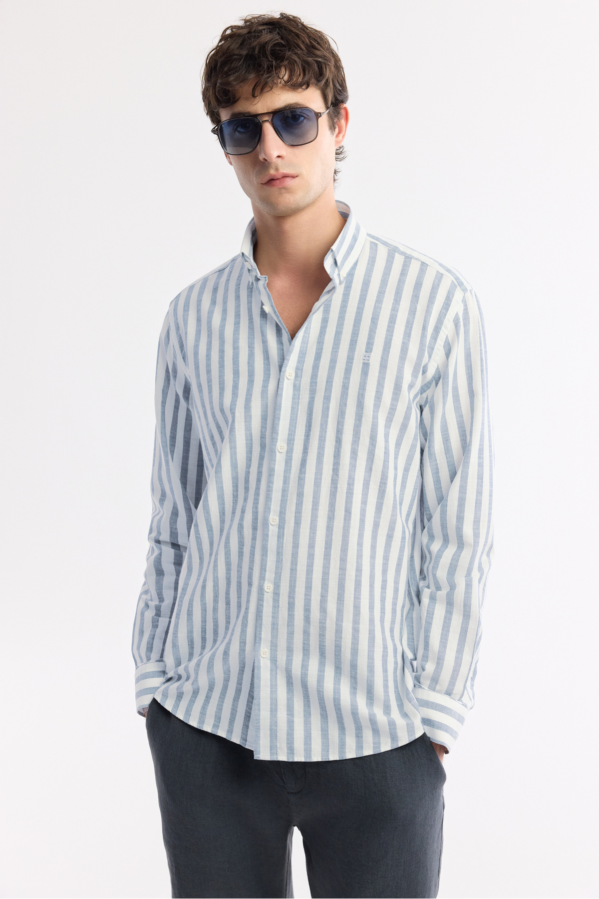 Erkek Lacivert Düğmeli Yaka Çizgili %100 Pamuk Comfort Fit Gömlek A51Y2167