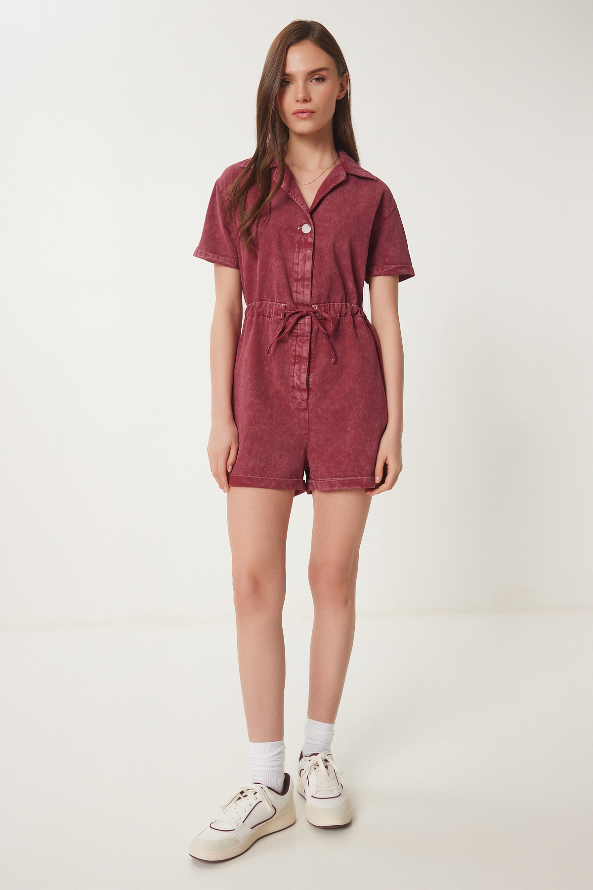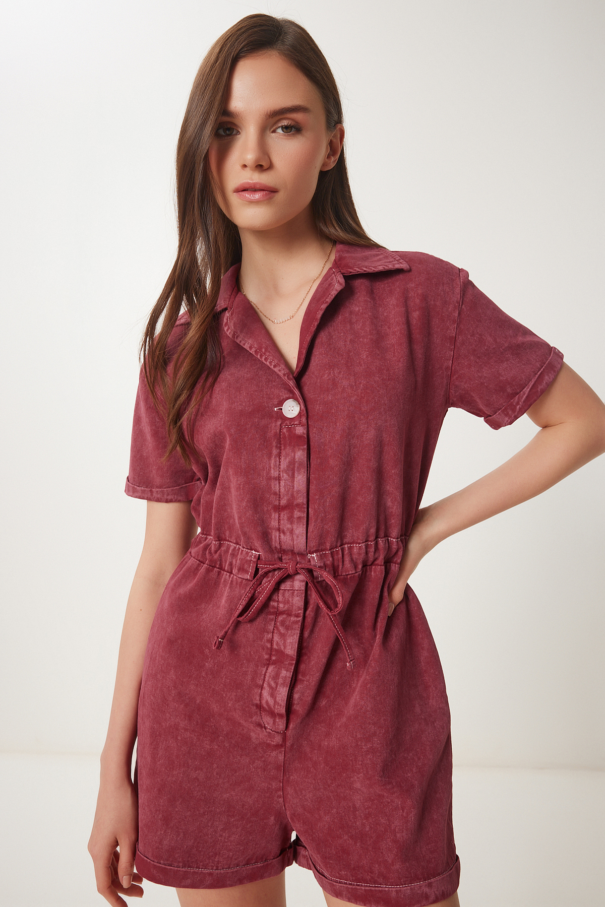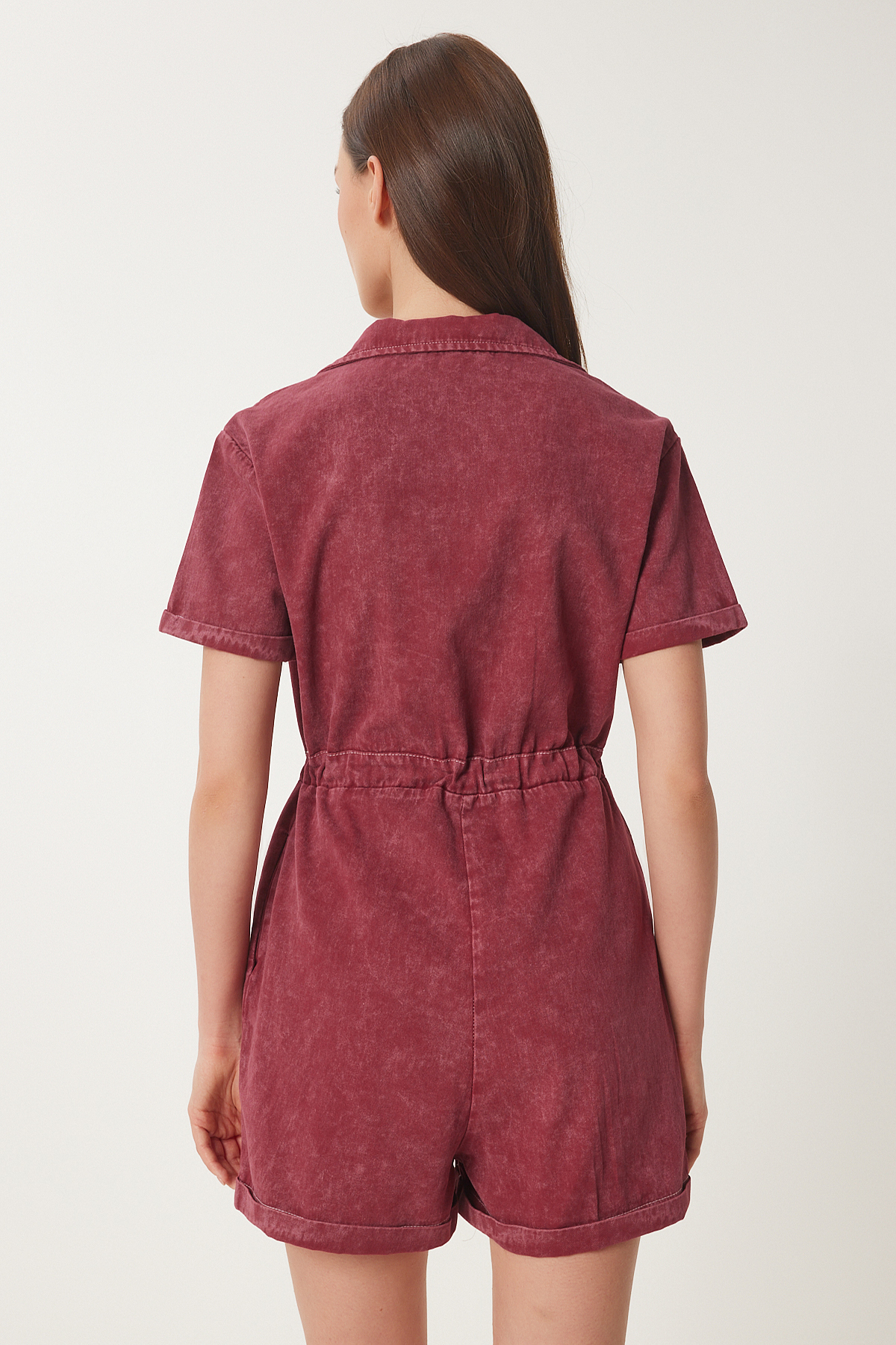 Polo yaka, düğme kapamalı, bağlama detaylı, yan cepli, yıkamalı gabardin tulum