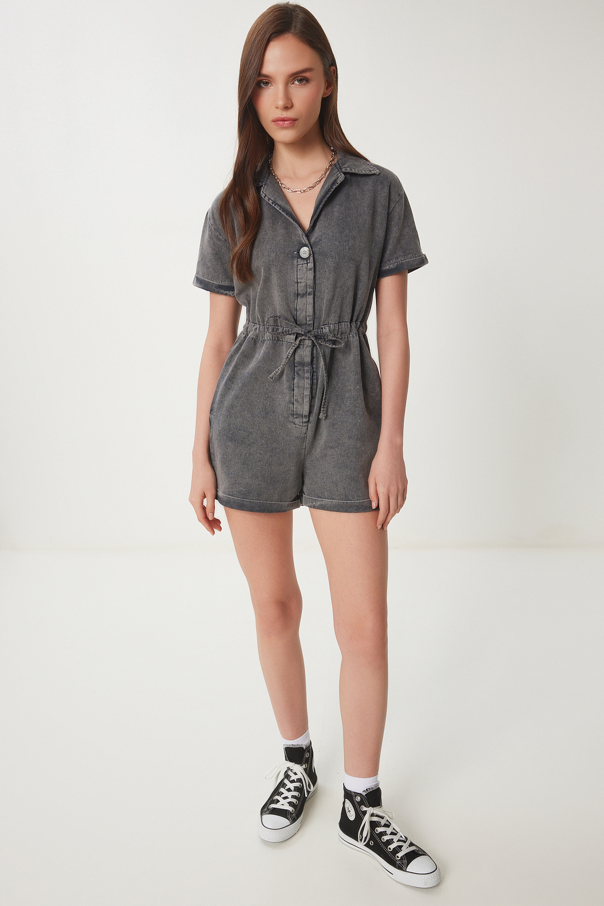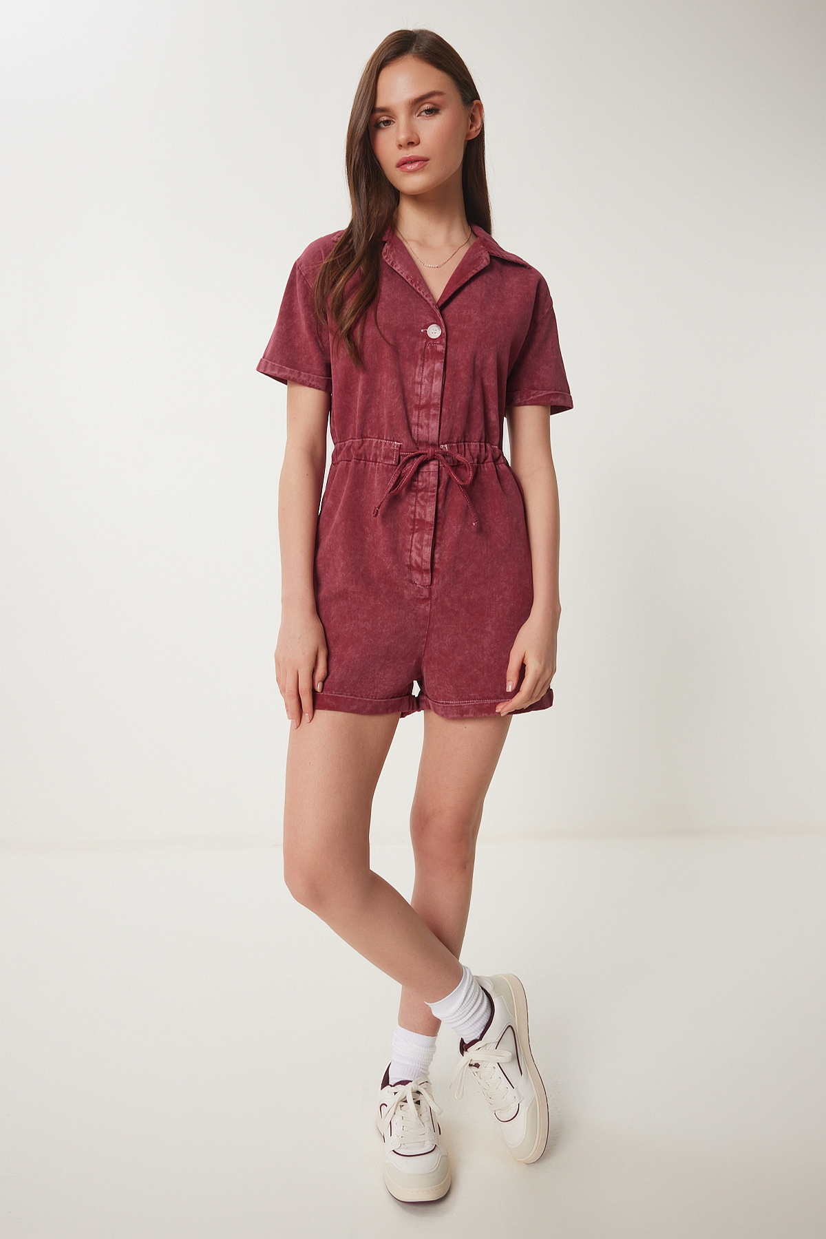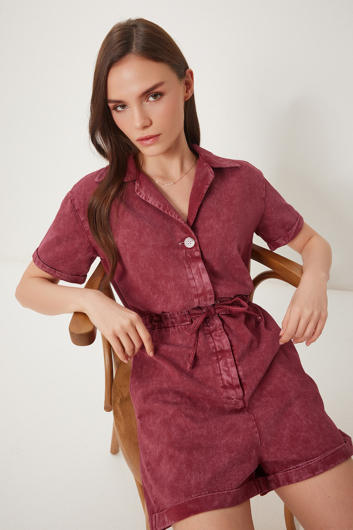 Polo yaka, düğme kapamalı, bağlama detaylı, yan cepli, yıkamalı gabardin tulum