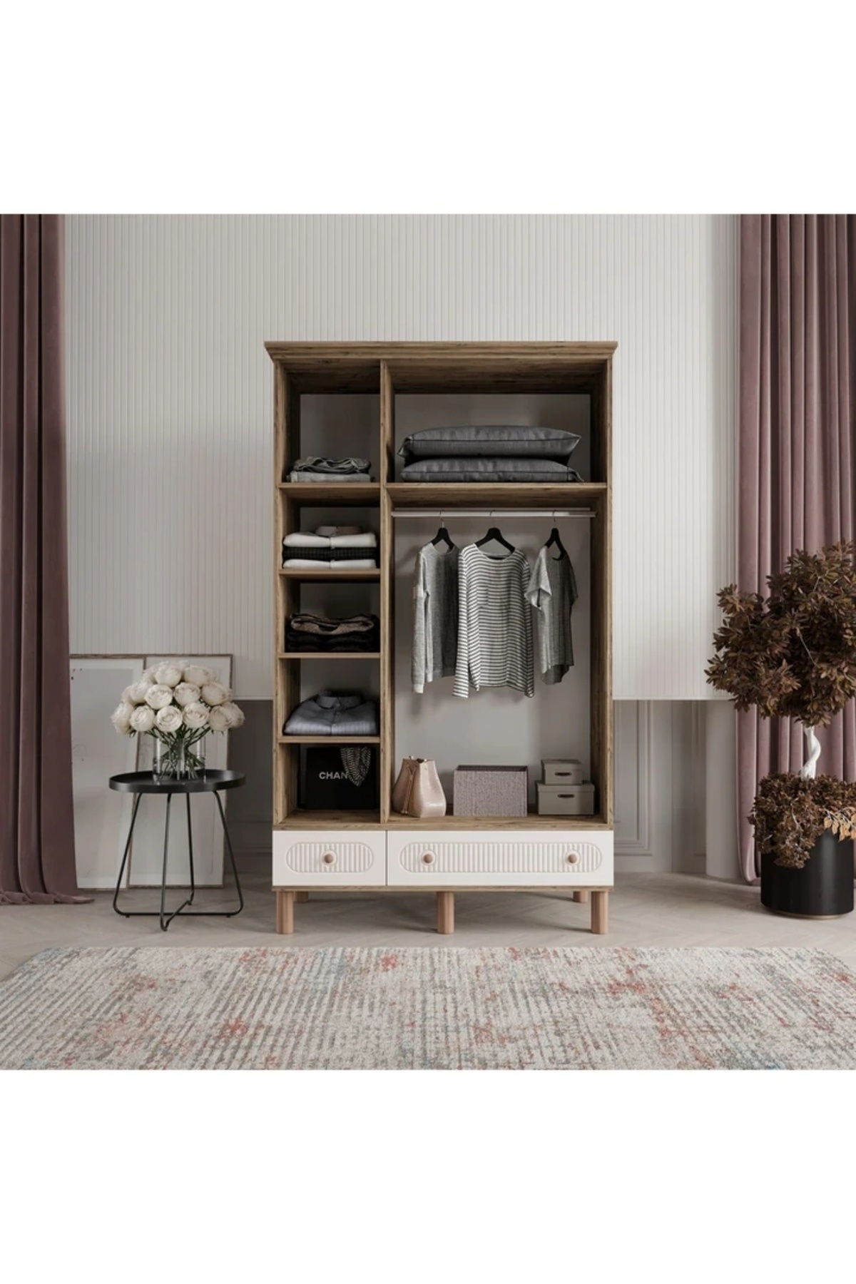 evinizin düzenini sağlarken dekoratif duruşuyla da dikkat çeker. Üstün Malzeme: Gövdesi birinci sınıf MDF lam malzemeden üretilmiştir. Kapaklar ve çekmece yüzeylerinde, estetik görünüm ve dayanıklılık sağlayan membran kaplama tercih edilmiştir. Kenar bantlarında darbelere karşı yüksek koruma sunan birinci sınıf PVC kullanılmıştır. Dayanıklı Donanım: Çekmecelerde tam açılım sağlayan teleskopik ray sistemi mevcuttur. Tüm montaj aksesuarları yüksek kaliteyle seçilerek, uzun ömürlü kullanım hedeflenmiştir. Kullanışlı İç Tasarım: Bir bölmesi askılı, diğer bölmesi raflı olarak tasarlanmış dolap içi