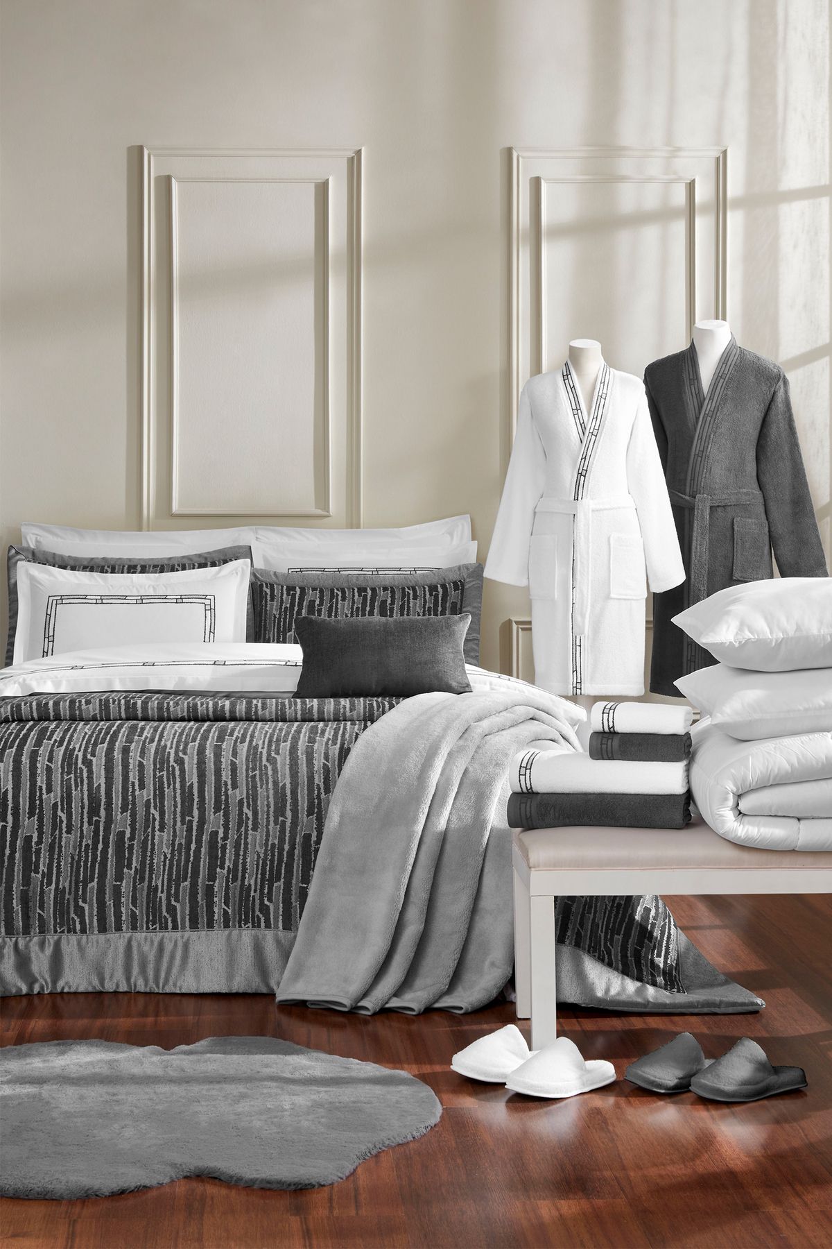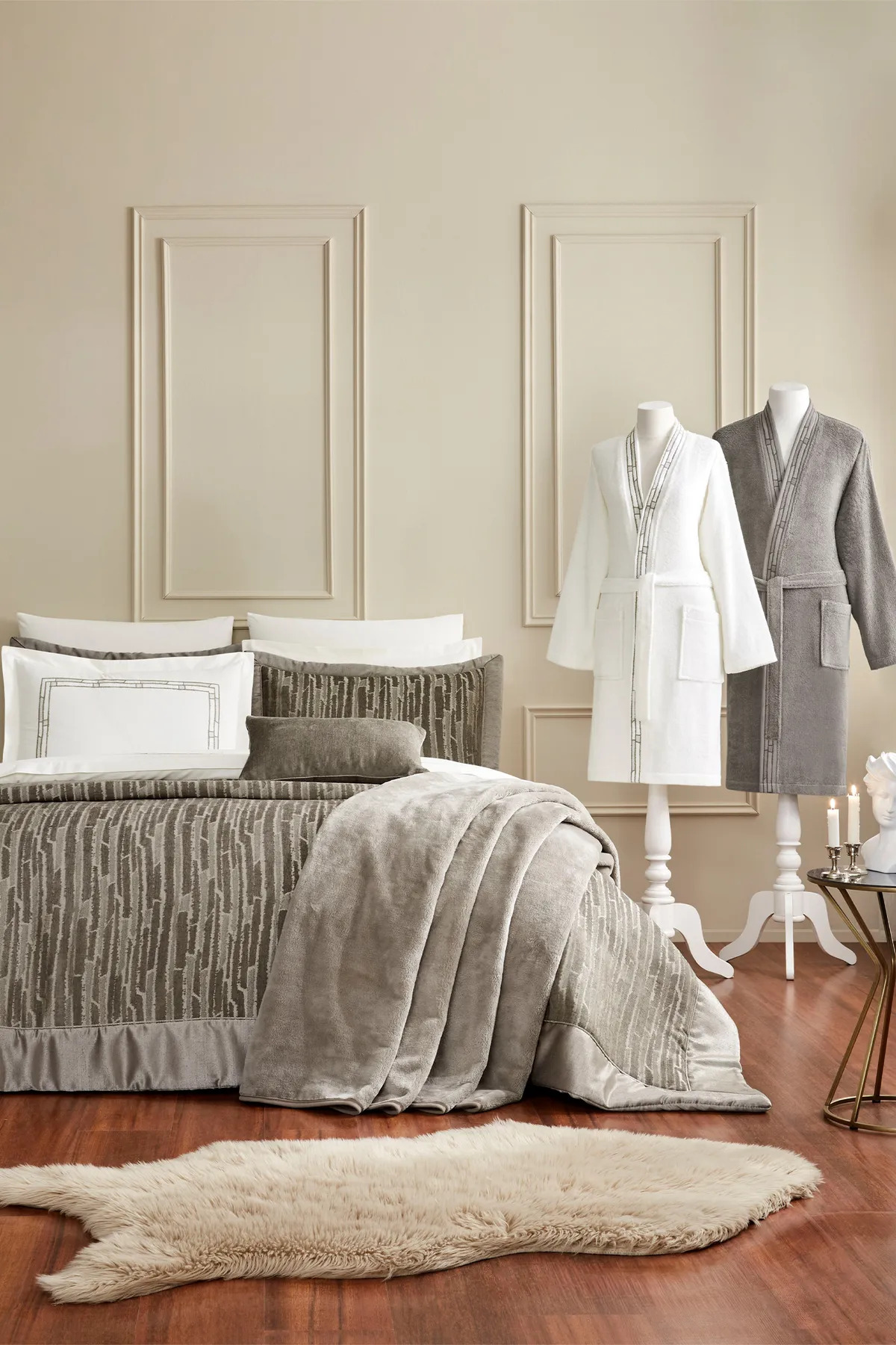 - Zarif gri renkteki çift kişilik çeyiz seti, modern ve şık bir görünüm sunar.