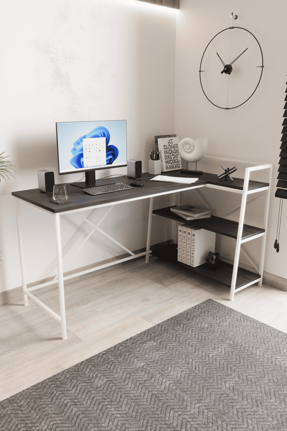 Siyah/Beyaz Raflı Çalışma Masası, Bilgisayar Masası, L Masa Flinder Kitaplıklı Çalışma Masası Bilgisayar Masası 1.Sınıf 18 mm suntalam malzemeden üretilmiştir.