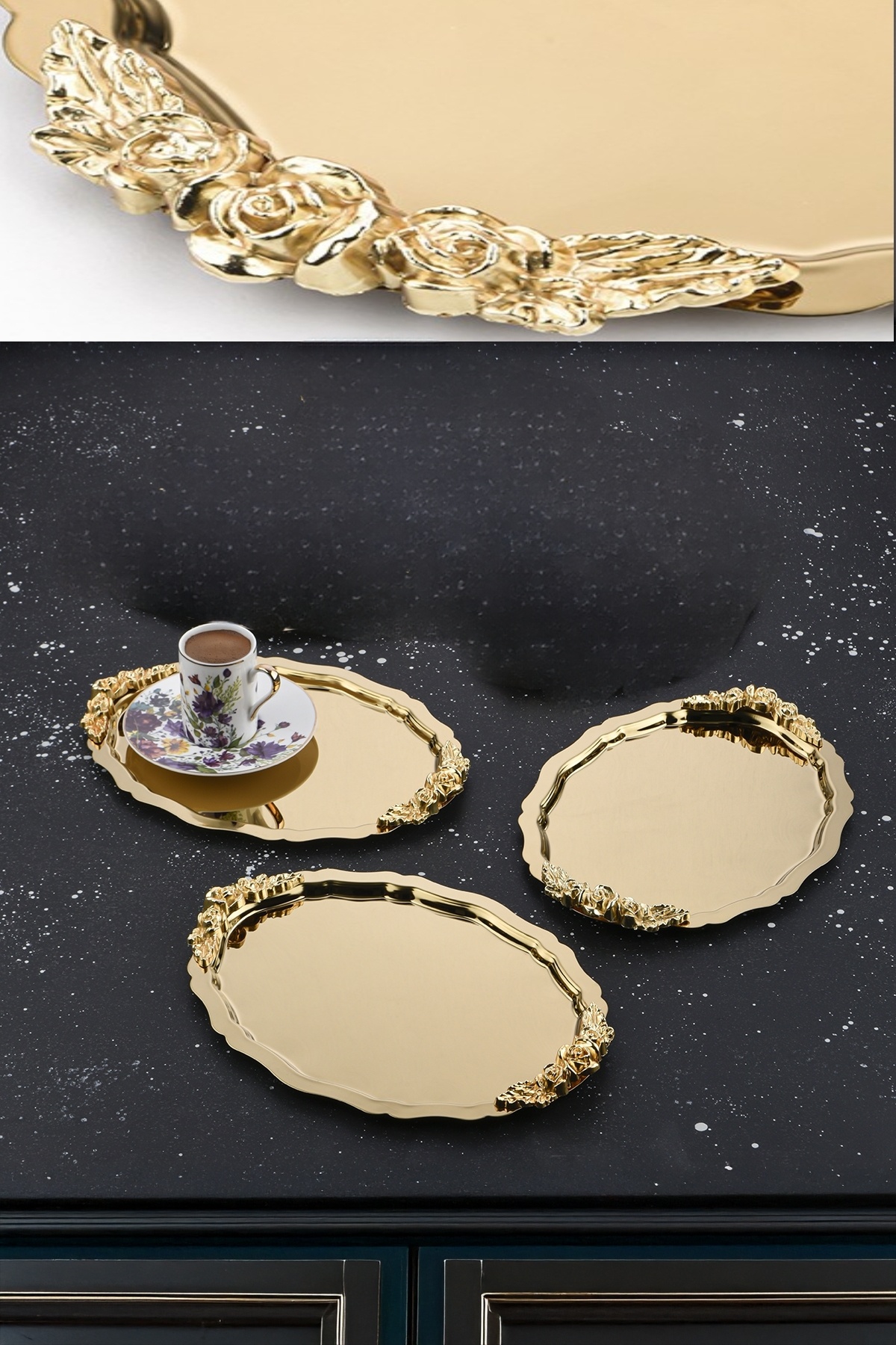- 6 Adet oval-bulut model gül motifli Gold sunum tepsisi, kahve ve çay servislerinizde şıklığı ve zarafeti ön plana çıkarır.
