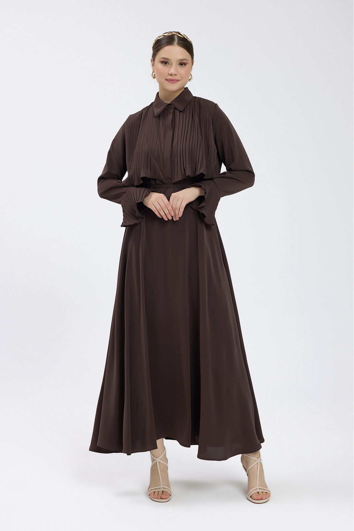 Acı Kahverengi Manşet Detaylı Piliseli Elbise