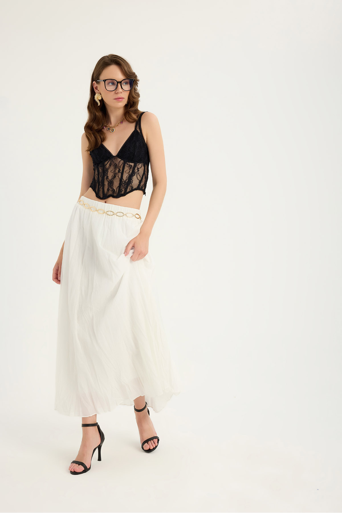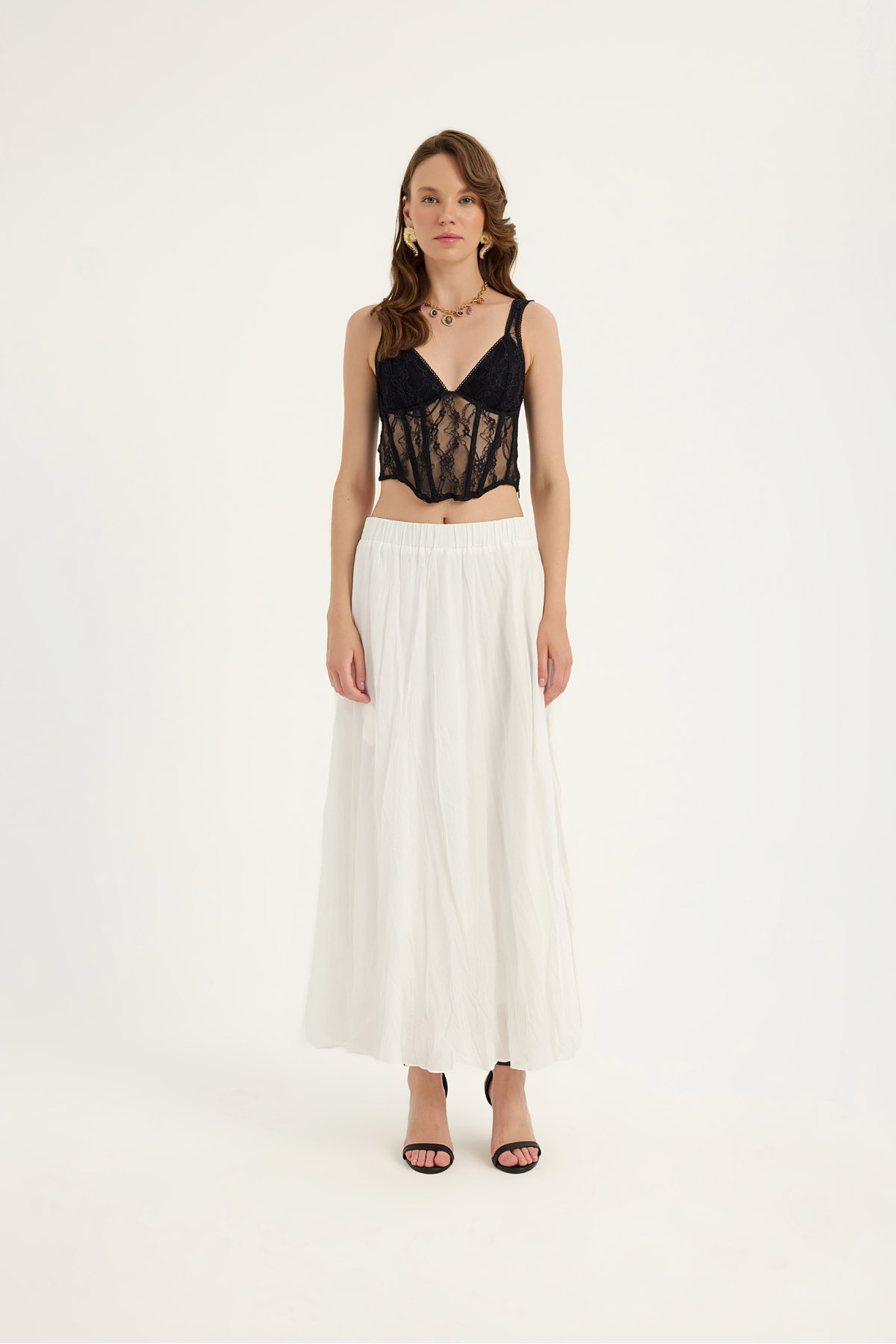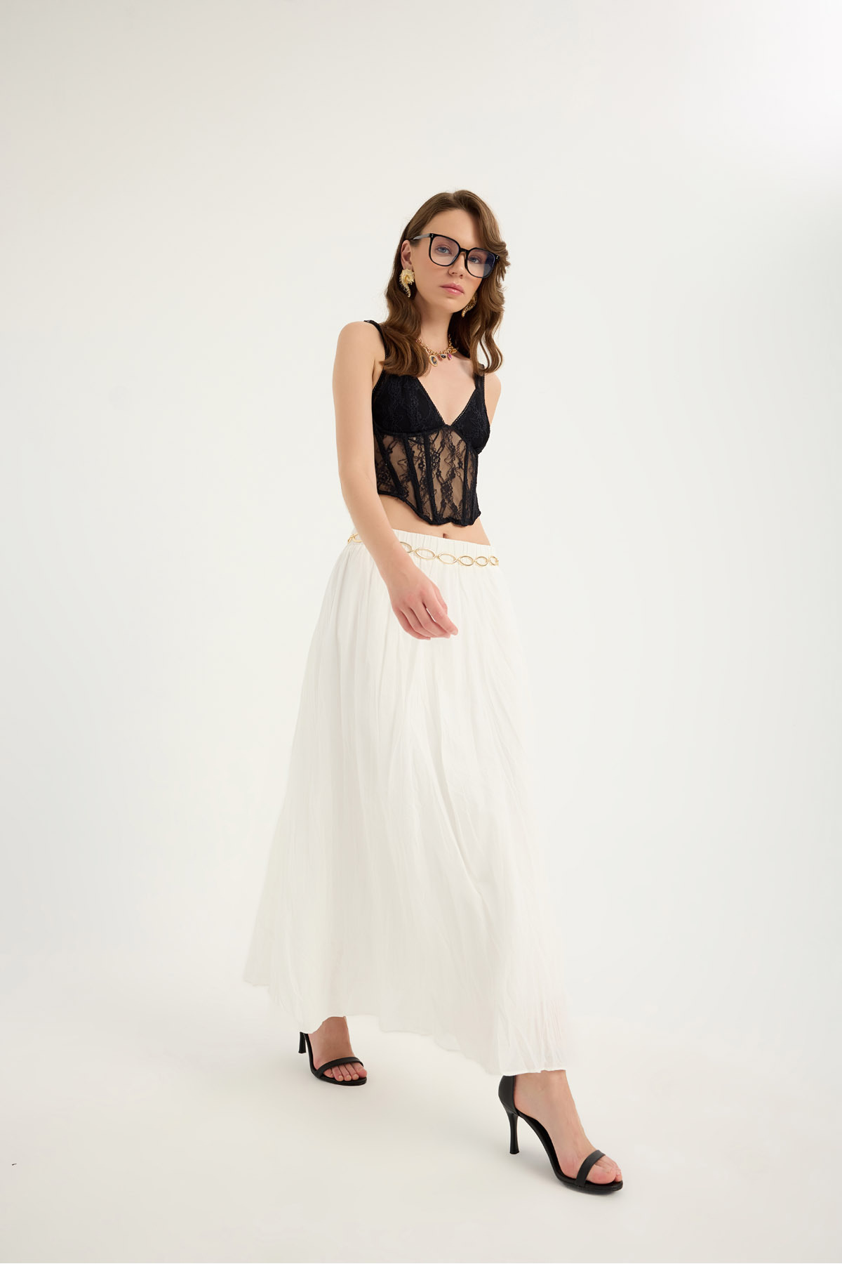 - Beyaz renkteki bu uzun etek, her gardıropta temel bir parça olarak yerini alır.