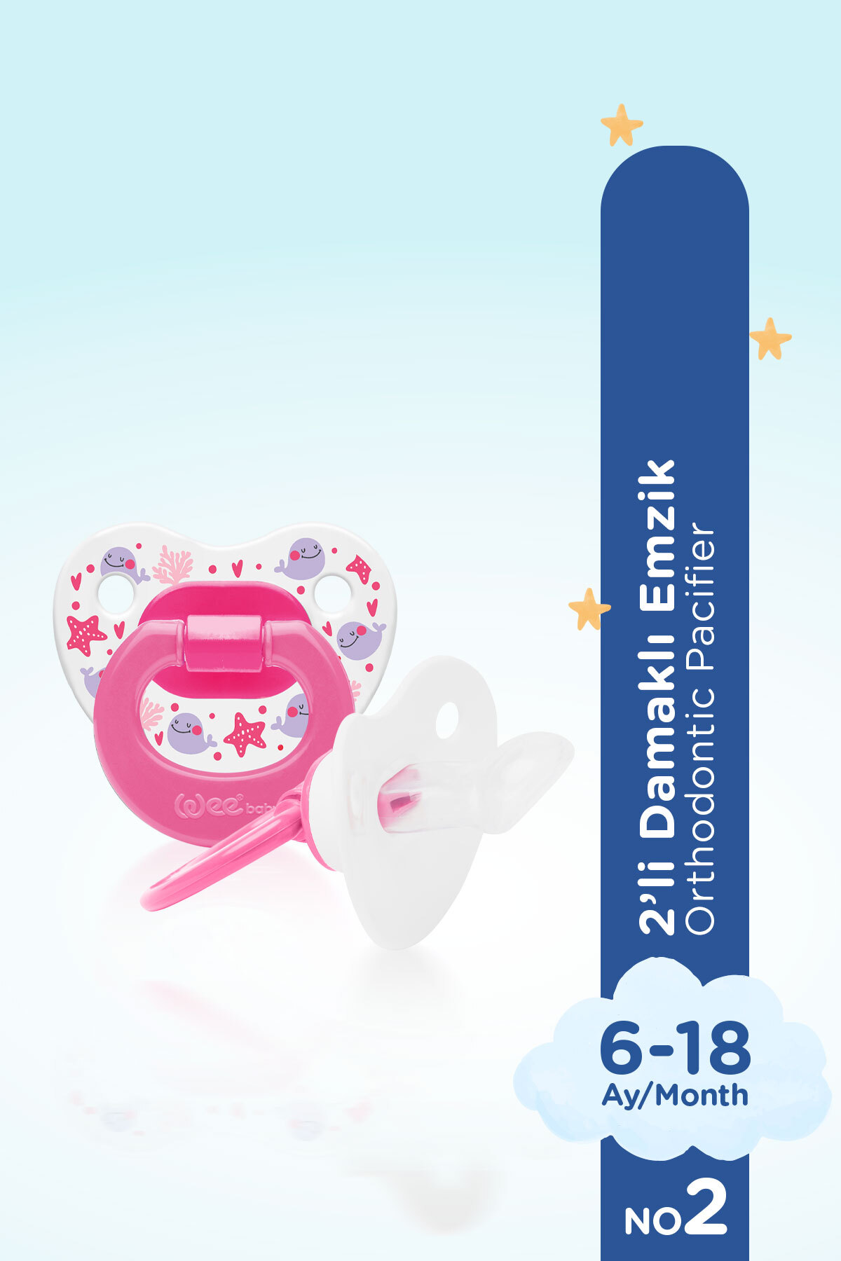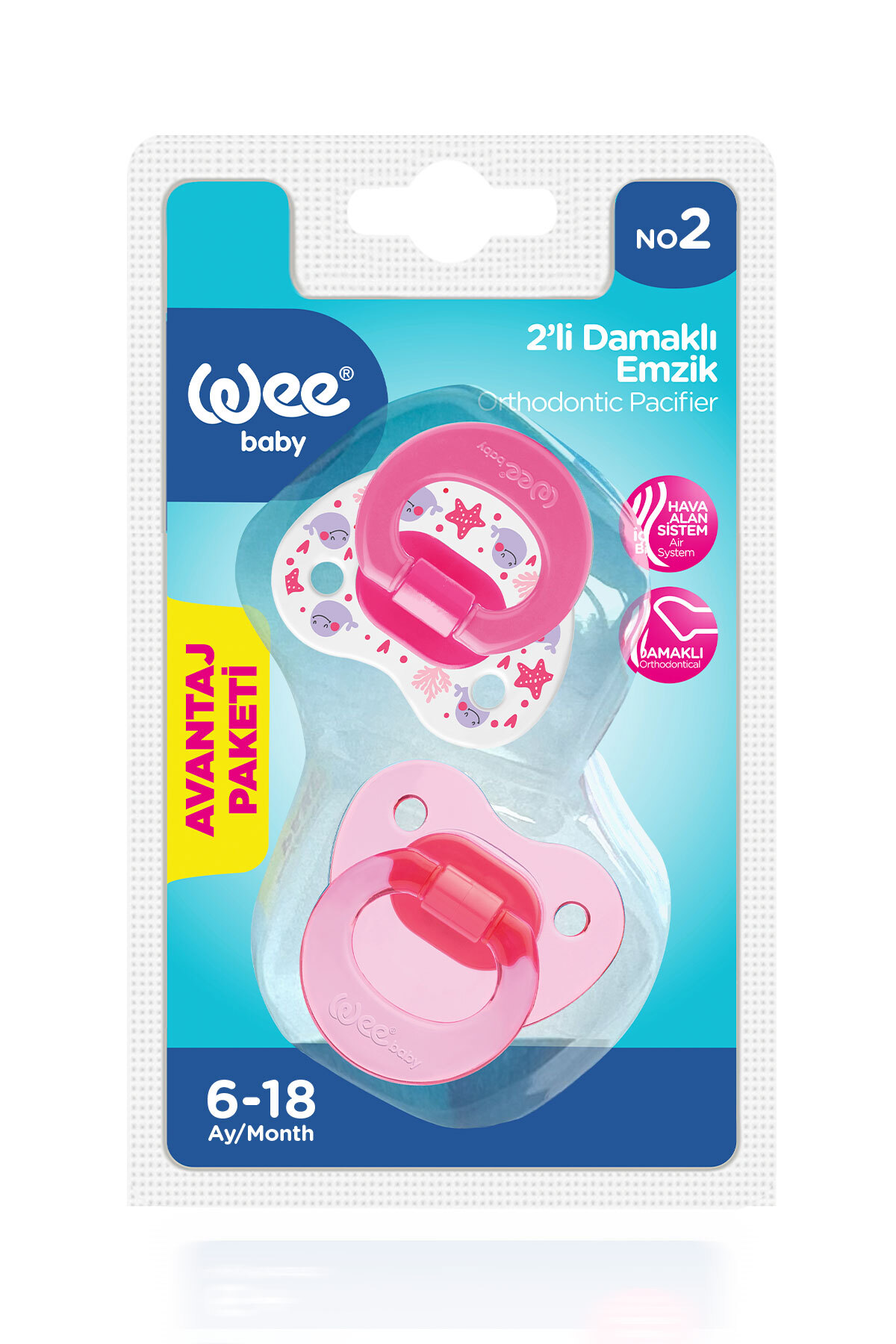 Bebeklerin emme refleksine karşı rahatlmaları için geliştirilen bebek emzikleri, hem annelerin hem de bebeklerin mutlu olmalarını sağlıyor. Kendi içinde birtakım özelliklere göre çeşitlere ayrılan emzik modelleri karşısında pek çok anne ideal emzik için kafa karışıklığı yaşıyor. Bu noktada Wee Baby emzik çeşitleri ile annelere birbirinden farklı seçenekler sunuyoruz. Bu emziklerden Desenli Damaklı Emzikler'in silikon emzik ucunun özel ortodontik tasarımı, bebeğin damak yapısına uyum sağlar ve deformasyonu önler. Emzikte bulunan Wee Air sistem ile emziğin içine hava girip çıkabilmekte ve bu sayede emzik ucu yumuşak kalıp şeklini korumaktadır. Bebeğin emme hareketine uyum sağlar damağın ve dişlerin doğal gelişimini destekler. Emzik kalkan bölümünde bebeğin ağız çevresinin tahriş olmaması için hava alabilen açıklıklar yer almaktadır. Bu sayede bebeğiniz emme ihtiyacını en doğal yoldan karşılayacaktır.