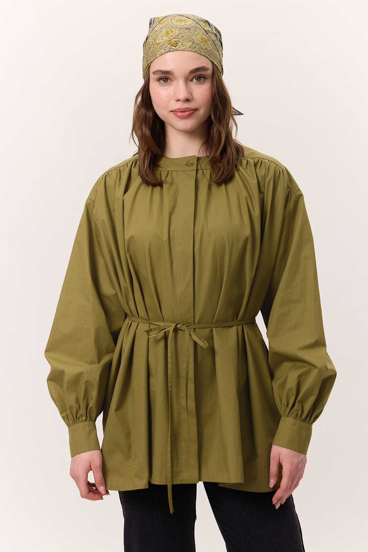 Yuvarlak yakalı, gizli düğme kapamalı, büzgü detaylı, geniş gömlek detaylı, büzgü detaylı uzun kol, manşetli, kuşaklı.
