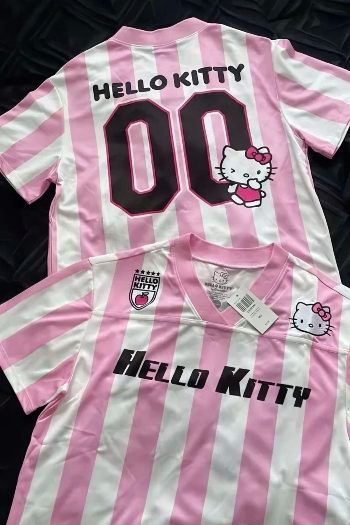 Pembe Beyaz V Yaka Çubuklu Jersey Hello Kitty T-Shirt