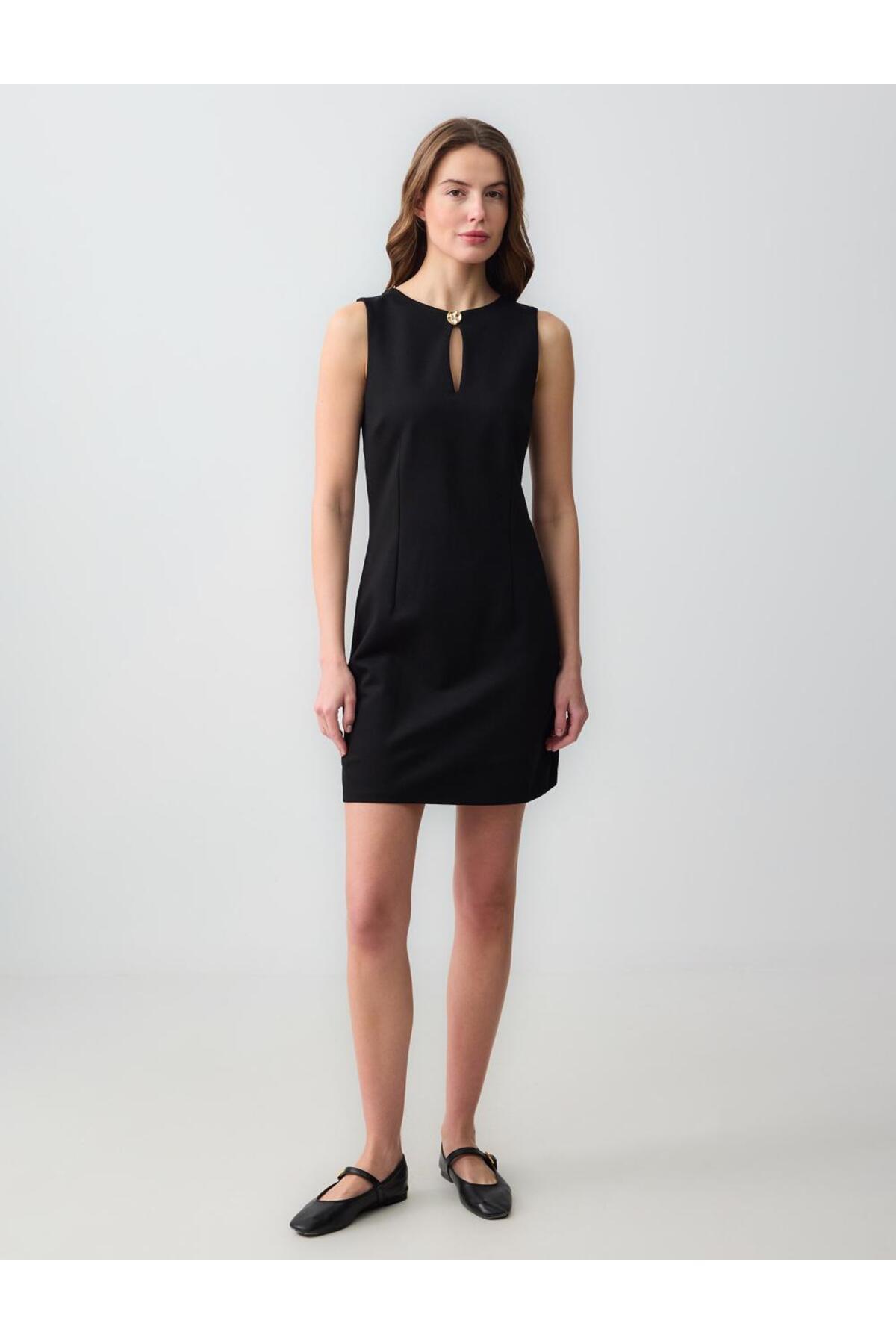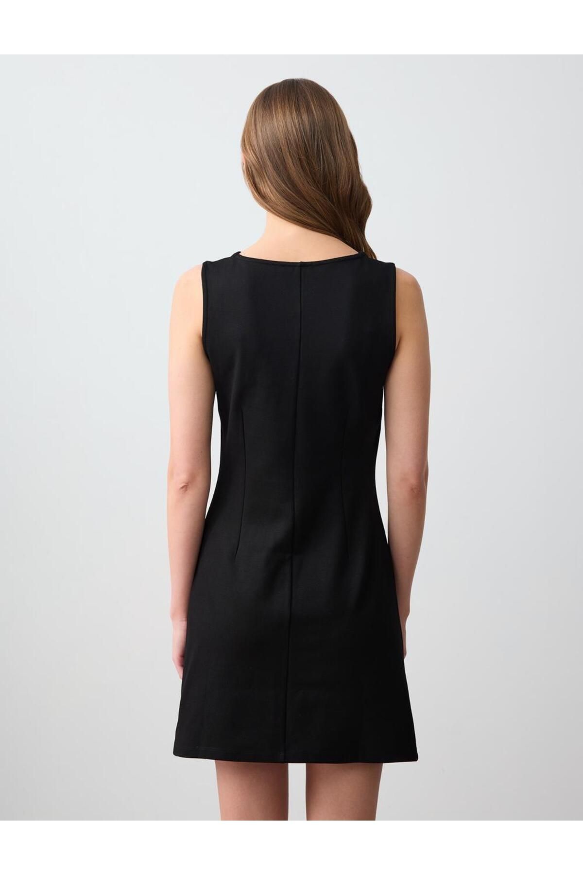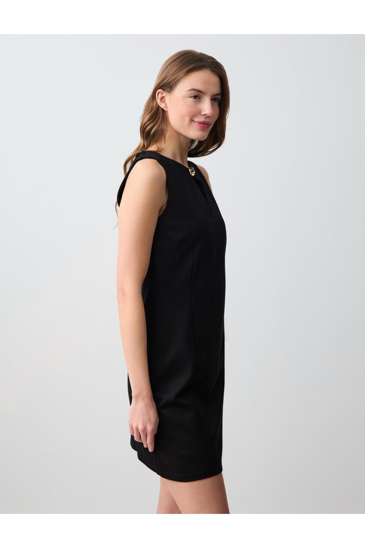 - Zarif siyah renkteki bu mini elbise, dar kesimi ile vücut hatlarını mükemmel şekilde sararak feminen bir siluet oluşturur.