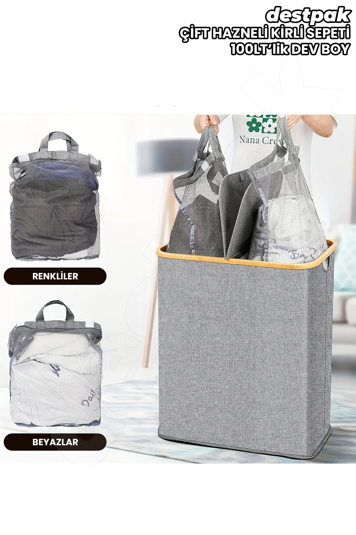 - İki bölmeli tasarımı sayesinde kirli çamaşırları düzenli bir şekilde saklamanızı sağlar.