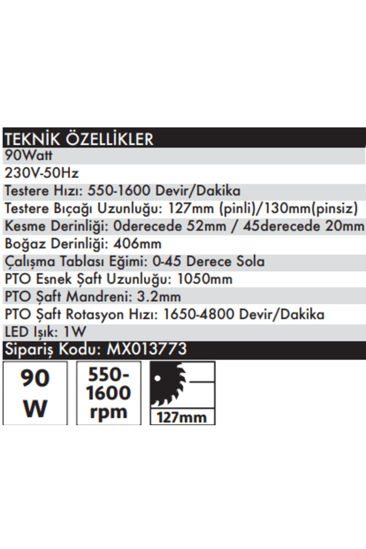 Teknik Özellikler Giriş Gücü: 90 W Gerilim: 230 V - 50 Hz Testere Hızı: 550-1600 D/Dak Led Işık: 1 W Testere Bıçağı Uzunluğu Pinli: 127 mm Testere Bıçağı Uzunluğu Pinsiz: 130 mm Boğaz Derinliği: 405 mm Kesme Derinliği 0º: 50 mm Kesme Derinliği 45º: 20 mm Çalışma tablası eğimi: 0 - 45º sola PTO Esnek Şaft Uzunluğu: 1050 mm PTO Şaft Mandreni: 3.2 mm PTO Şaft Rotasyon Hızı: 1650-4800 D/Dak Toz çıkışı: 35 mm Koruma seviyesi: I Ölçüler: 640 (U) x 335 (G) x 390 (Y) Net Ağırlık: 11.6 Kg Teslimat içeriği 1 Adet - MX3773 dekopaj testere 1 Adet - PTO Esnek döner şaft 2 Adet - Pimsiz kıl testere ucu sıkma aksesuarı 2 Adet - Allen anahtar (2.5/3mm) 1 Adet - Açık ağız anahtar 1 Adet - Esnek şaft için L anahtar 1 Adet - Pimsiz kıl testere ucu (aparatlar ile kullanılması gerekir) 1 Adet - Pimli kıl testere ucu (makina üzerinde) 1 Kutu - Esnek Döner şaft aksesuarları