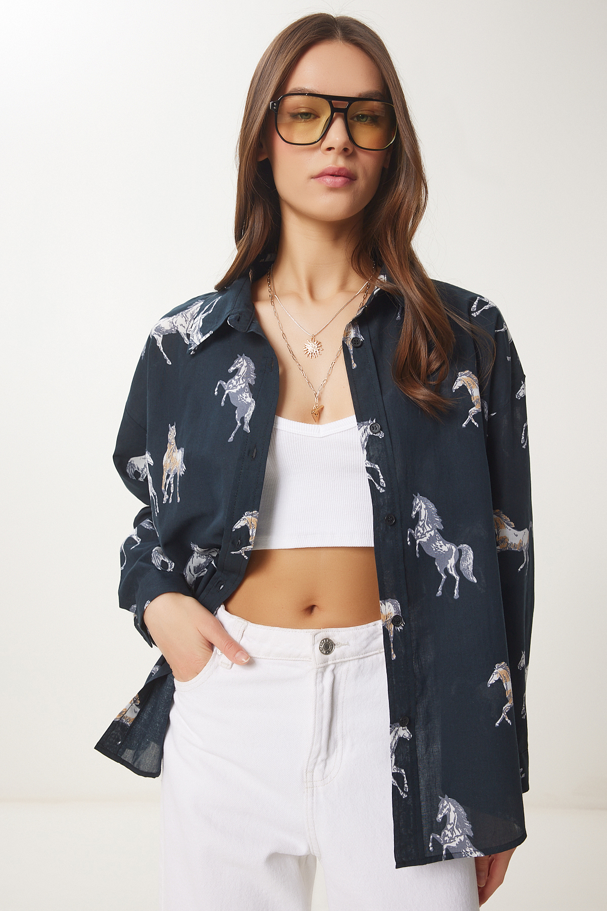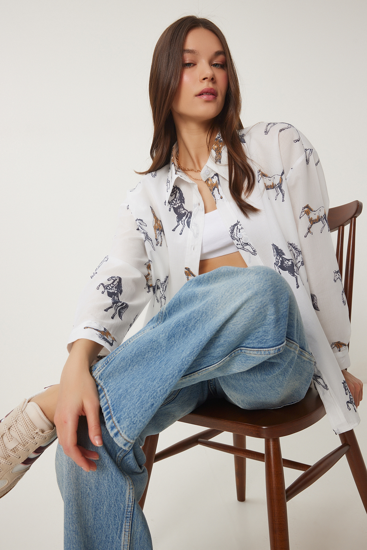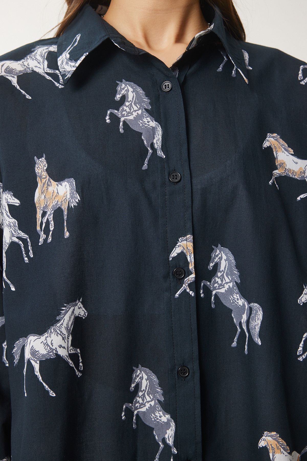 Desenli, düğme kapamalı, düşük omuzlu, hafif transparan dokuma gömlek