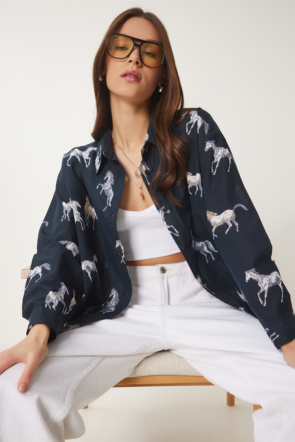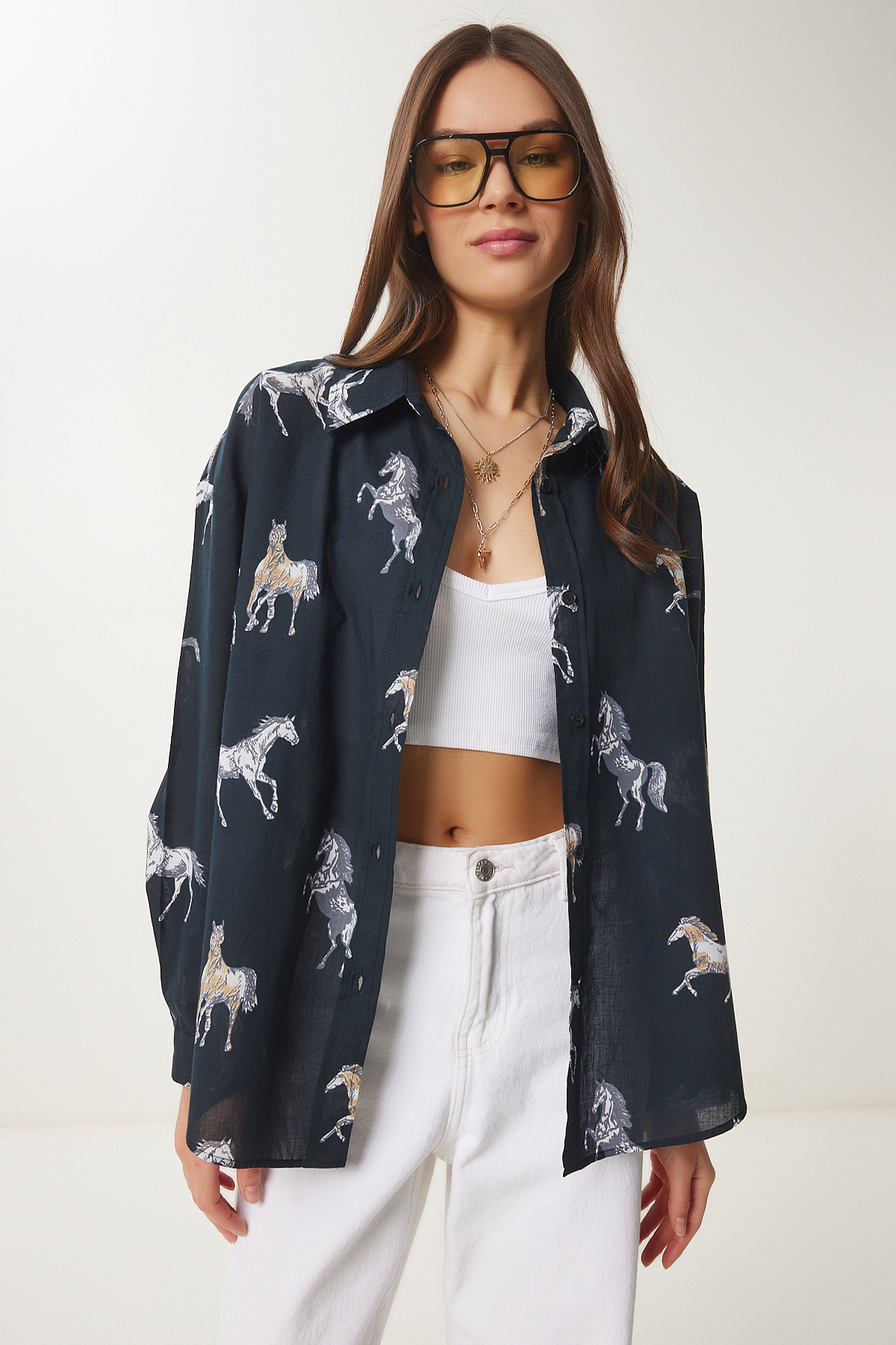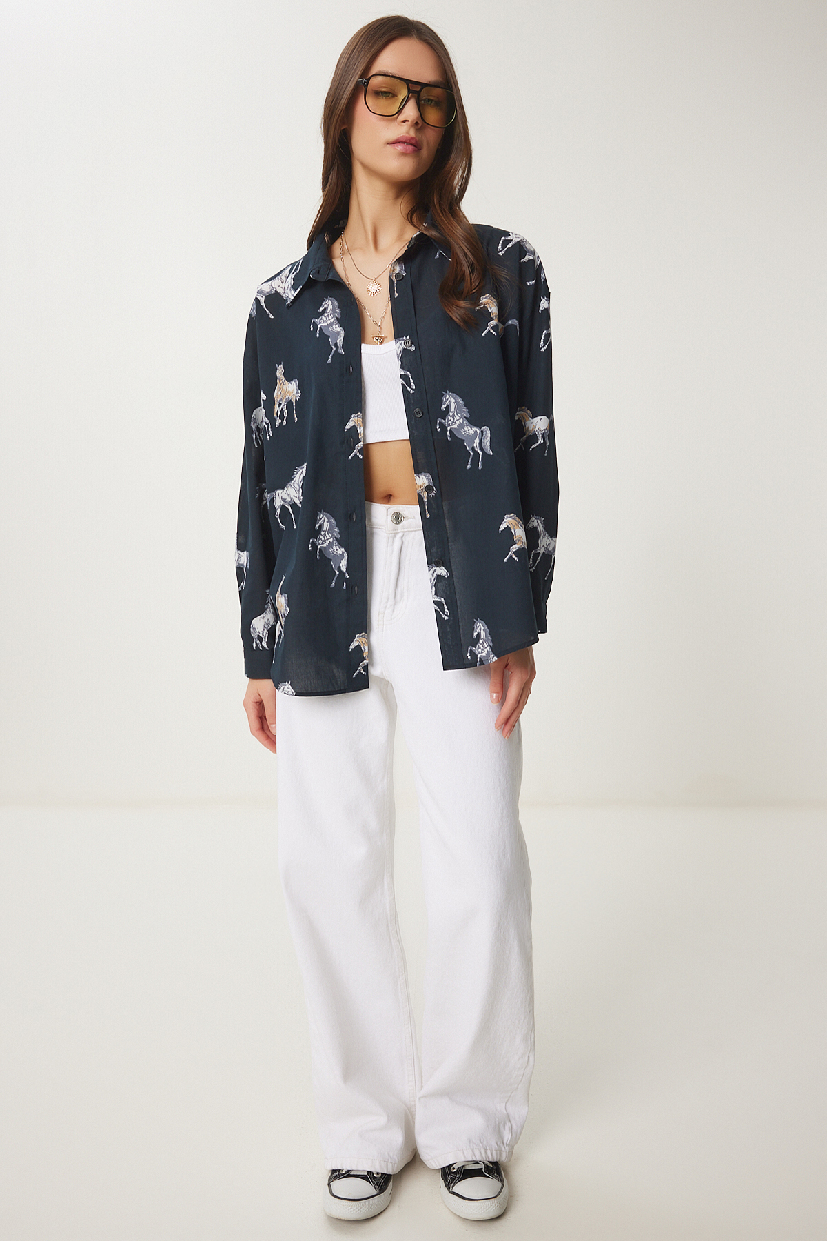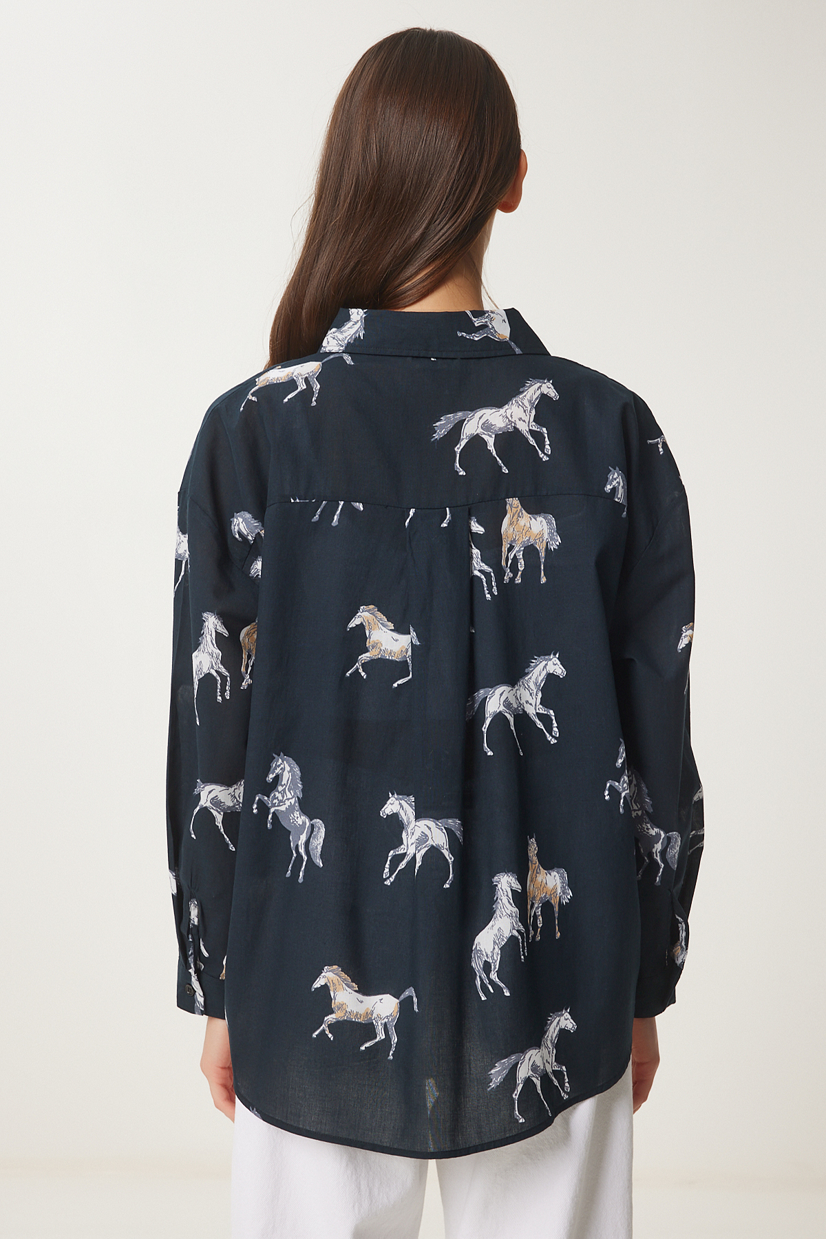 Desenli, düğme kapamalı, düşük omuzlu, hafif transparan dokuma gömlek