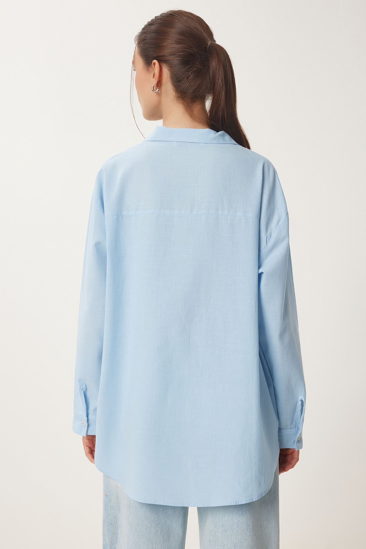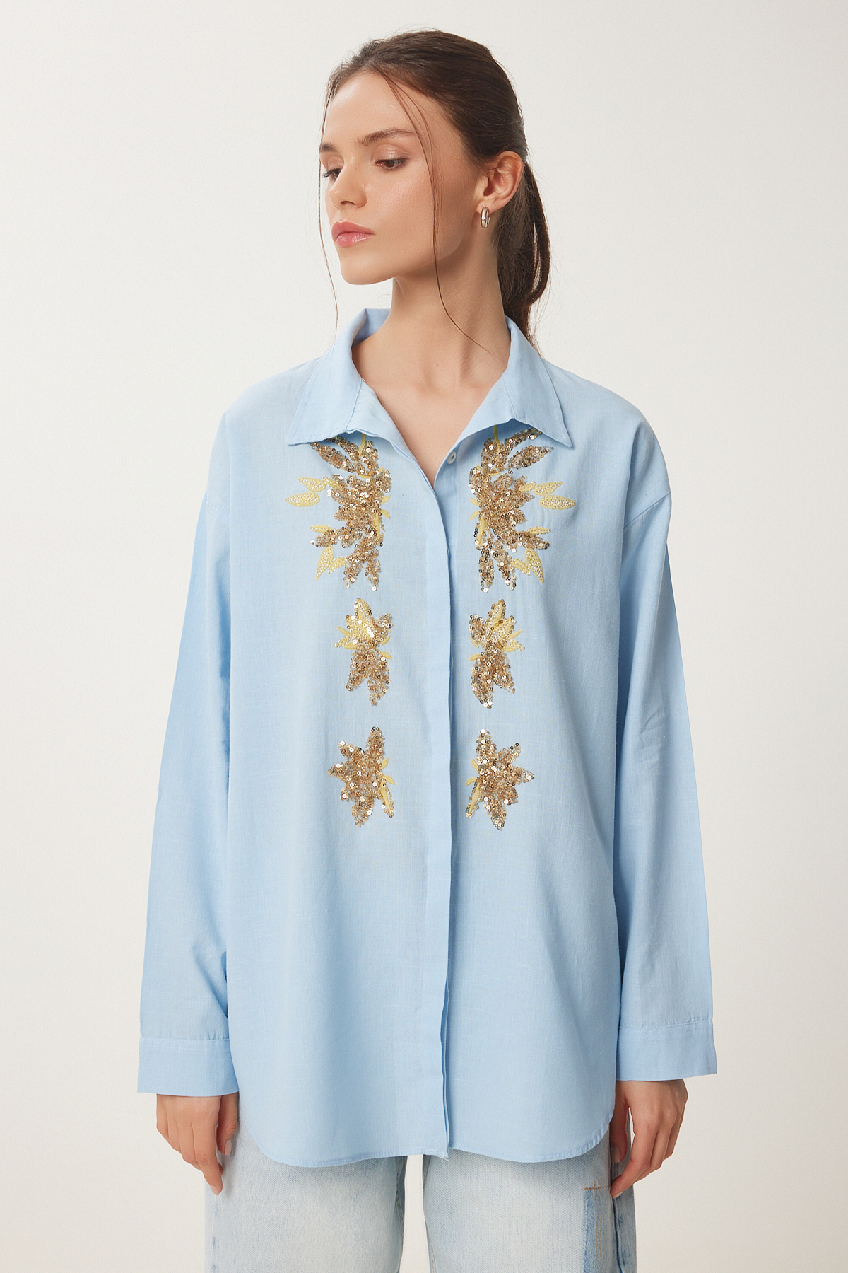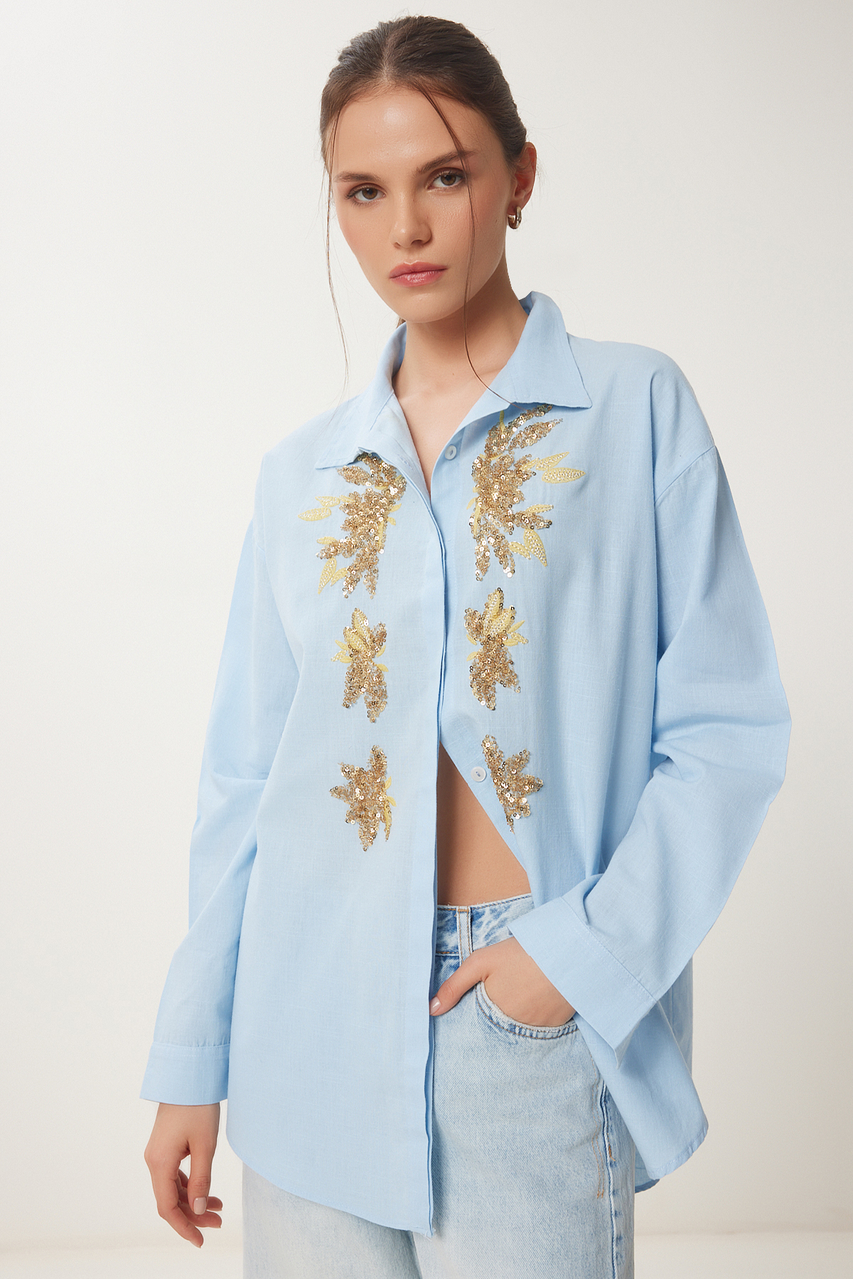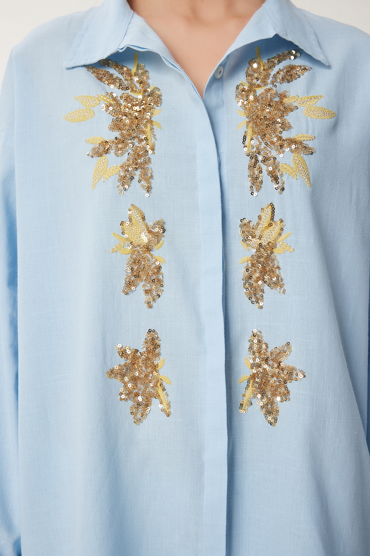 Düğme kapamalı, düşük omuzlu, nakış ve pul işlemeli keten gömlek