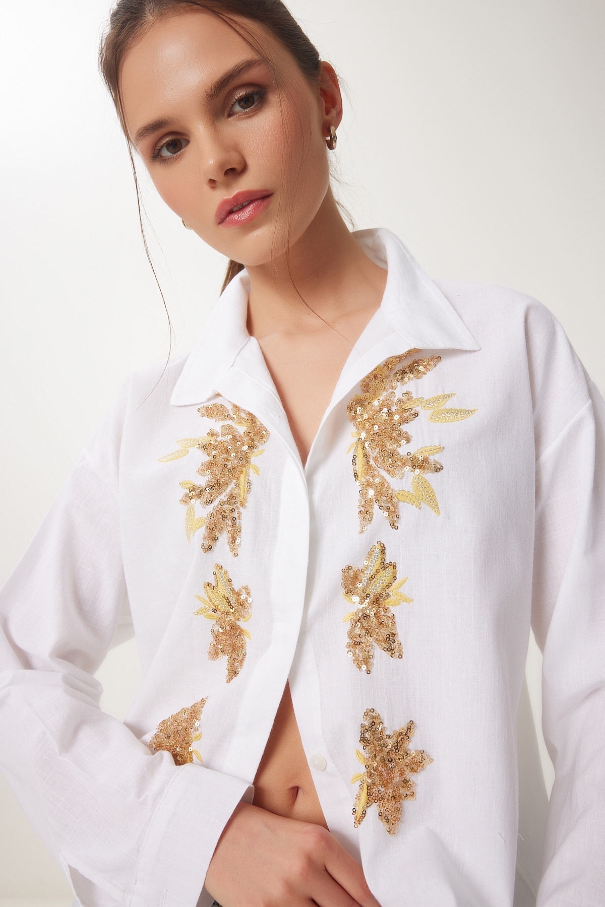 Kadın Beyaz Nakış İşlemeli Pullu Keten Gömlek JH00052