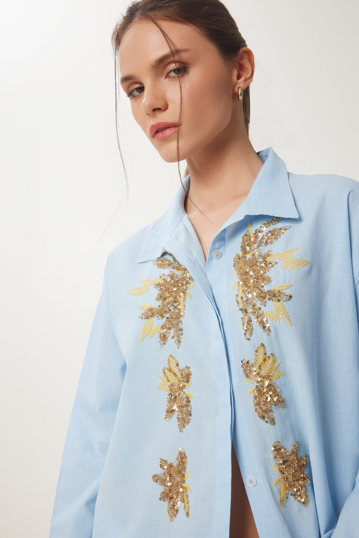 • Düğme kapamalı, düşük omuzlu, nakış ve pul işlemeli keten gömlek