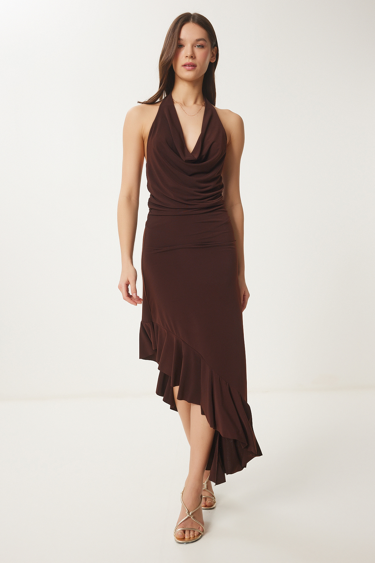 Kadın Kahverengi Asimetrik Kesim Midi Sandy Elbise UB00373