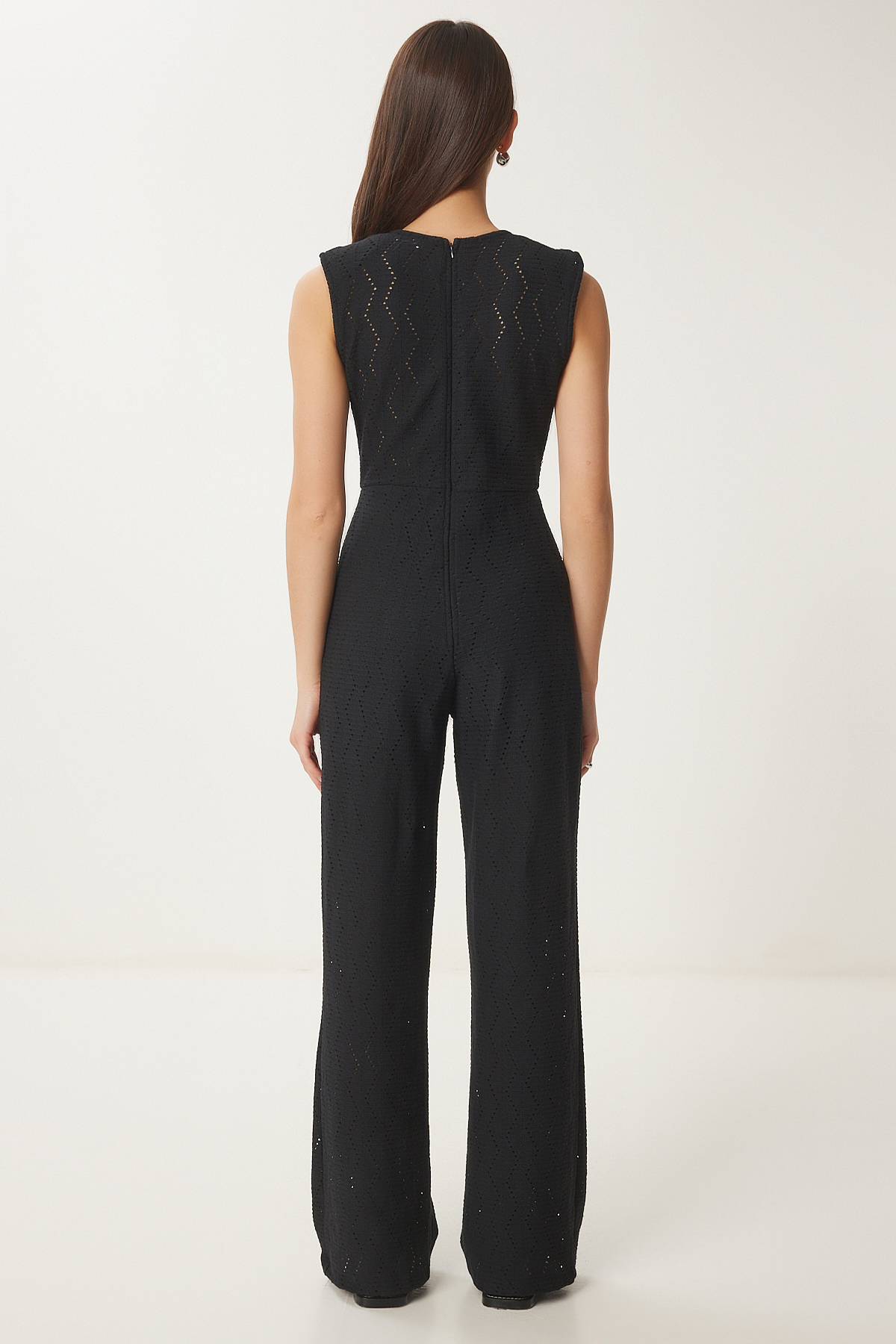 Bisiklet yaka, gizli fermuar kapamalı, likralı, astarlı, vatkalı ajurlu örme tulum